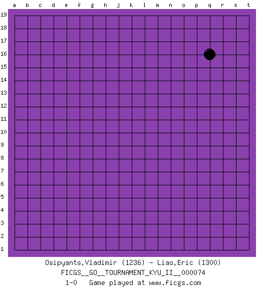 Last move : 1-0 2022 April 3 23:21:6 [Event "FICGS__GO__TOURNAMENT_KYU_II__000074"] [Site "FICGS"] [Date "2022.02.14"] [Round "1"] [Black "Osipyants,Vladimir"] [White "Liao,Eric"] [Result "1-0"] [Rating 1 "1236"] [Rating 2 "1300"] 1.q16 1-0 This go game has been lost on time (started : 2022.02.14 23:51:23) Here are the names of the openings (joseki) played in the four corners : Player Black won this Go (weiqi, baduk) game. Follow this game move after move (download)Don't overlook the edge of the board. (Anonymous) He is a liar. I just don't know what the lie is yet. (Horatio Caine, C.S.I. Miami)