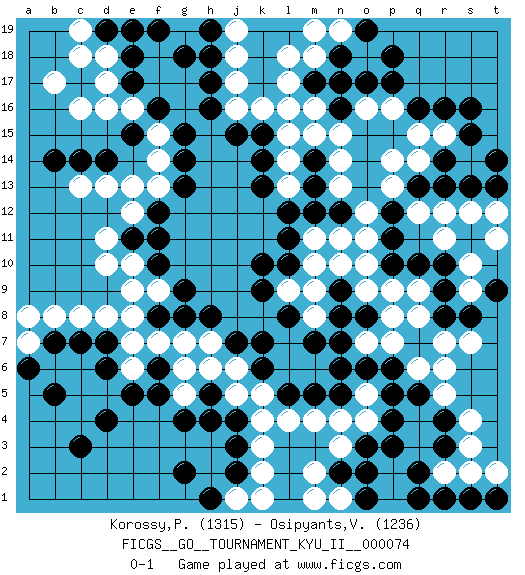 Last move : 0-1 2022 July 15 11:19:5 [Event "FICGS__GO__TOURNAMENT_KYU_II__000074"] [Site "FICGS"] [Date "2022.02.14"] [Round "1"] [Black "Korossy,Peter"] [White "Osipyants,Vladimir"] [Result "0-1"] [Rating 1 "1315"] [Rating 2 "1236"] 1.q16 q4 2.d4 c16 3.e17 d13 4.h16 l16 5.n16 j17 6.h17 d10 7.d7 r6 8.r9 q12 9.r14 l14 10.k15 l15 11.m17 l17 12.k14 n14 13.k13 p14 14.q13 p13 15.p12 o12 16.p11 o11 17.p10 k4 18.g4 n4 19.c3 c8 20.c7 d8 21.k10 f9 22.f12 f14 23.g14 f15 24.g15 f13 25.g13 e12 26.f11 e16 27.e18 c18 28.k6 j5 29.n6 m10 30.l8 o9 31.g9 j6 32.k7 e7 33.b7 b8 34.d6 e6 35.m12 p9 36.q10 o10 37.q7 r7 38.j3 k3 39.j2 k2 40.p6 q6 41.p4 o5 42.p5 p7 43.o6 q3 44.p3 g7 45.n2 m2 46.n5 n3 47.o2 o4 48.j4 k5 49.g8 g6 50.f10 e9 51.f8 e8 52.l11 q8 53.s8 s7 54.q2 r2 55.q5 r5 56.n8 m9 57.l5 l4 58.m5 m4 59.r1 s2 60.s1 s3 61.j7 h7 62.h8 j18 63.g18 m18 64.n18 m16 65.n17 l18 66.f16 d17 67.m13 q14 68.r13 p16 69.p17 q15 70.r16 r15 71.s15 s14 72.s16 o16 73.o17 n15 74.m14 m15 75.e5 a7 76.a6 a8 77.b5 j1 78.h1 k1 79.g2 r12 80.s13 s12 81.t14 s10 82.r10 s9 83.s11 r11 84.t9 t11 85.r8 q9 86.h5 g5 87.f5 t12 88.t13 n19 89.o19 m19 90.p18 m8 91.m7 l9 92.k9 j16 93.j15 l13 94.l12 n13 95.d19 c19 96.o8 p8 97.n9 m11 98.e11 d11 99.h19 j19 100.h18 d18 101.f19 k16 102.e19 o7 103.n7 n1 104.o1 m1 105.o3 e10 106.q1 t2 107.n12 n11 108.h4 h6 109.f6 f7 110.t1 pass 111.r4 s4 112.r3 pass 113.l10 n10 114.e15 d16 115.d14 e13 116.c14 c13 117.b14 b17 118.pass pass 0-1 Here are the names of the openings (joseki) played in the four corners : Corner d16 : c16 e17 Komoku (Somok, Xiao~mu`) 3-4 Point. The komoku (3-4) point is the traditional corner enclosure move.. Ikken Kakari (Hankan Keolch'im, Yi Gua`jiao~, 1-Space Low Pincer). The small knight move is the basic approach move to the 3-4 point stone. It has been continually used for over four centuries. There are limitless variations, with new moves constantly being discovered. Black 2 opens the door to a treaure store of joseki. Corner q16 : q16 l16 Hoshi (Hwajeom, Seongjeom, Xingwei`) 4-4 Point. The star or hoshi (4-4) point, emphasizing influence at the potential expense of territory. Player White won this Go (weiqi, baduk) game. Follow this game move after move (download)Error is one of the sources of transformation. (Pierre Audouard) There is no vagueness without wind. (Chinese proverb)
