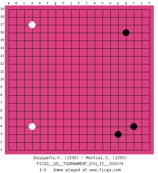 Last move : 1-0 2022 April 6 1:19:26 [Event "FICGS__GO__TOURNAMENT_KYU_II__000074"] [Site "FICGS"] [Date "2022.02.14"] [Round "1"] [Black "Osipyants,Vladimir"] [White "Montiel,Sebastian"] [Result "1-0"] [Rating 1 "1236"] [Rating 2 "1250"] 1.q16 d4 2.r4 d17 3.p3 1-0 This go game has been lost on time (started : 2022.02.14 23:51:23) Here are the names of the openings (joseki) played in the four corners : Player Black won this Go (weiqi, baduk) game. Follow this game move after move (download)To invade, need 20 points in open area; otherwise, keshi is best. (Yang Yilun, 7p) I find television to be very educating. Every time somebody turns on the set, I go in the other room and read a book. (Groucho Marx)