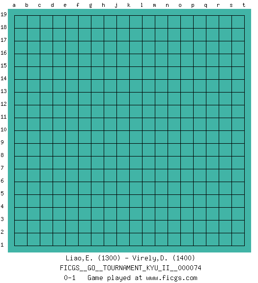 Last move : 0-1 2022 March 17 1:44:33 [Event "FICGS__GO__TOURNAMENT_KYU_II__000074"] [Site "FICGS"] [Date "2022.02.14"] [Round "1"] [Black "Liao,Eric"] [White "Virely,Daniel Francois"] [Result "0-1"] [Rating 1 "1300"] [Rating 2 "1400"] 0-1 This go game has been lost on time (started : 2022.02.14 23:51:23) Here are the names of the openings (joseki) played in the four corners : Player White won this Go (weiqi, baduk) game. Follow this game move after move (download)Don't defend - extend ! (Bill Taylor) It's not a bug - it's an undocumented feature. (Anonymous)