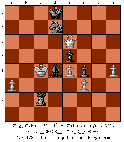 Last move : 1/2-1/2 2008 January 1 17:46:23 [Event "FICGS__CHESS__CLASS_C__000053"] [Site "FICGS"] [Date "2007.07.29"] [Round "1"] [White "Staggat,Rolf"] [Black "Stibal,George"] [Result "1/2-1/2"] [WhiteElo "1661"] [BlackElo "1941"] 1.e4 c5 2.Nf3 d6 3.d4 cxd4 4.Nxd4 Nf6 5.Nc3 a6 6.Be3 e6 7.g4 e5 8.Nf5 g6 9.g5 gxf5 10.gxf6 f4 11.Bd2 Be6 12.Qf3 Rg8 13.Bh3 Nd7 14.Bxe6 fxe6 15.Qh5+ Rg6 16.f7+ Kxf7 17.Qxh7+ Bg7 18.Qh3 Qb6 19.Qf3 Rg8 20.O-O-O Bh6 21.Kb1 Qc6 22.Bc1 b5 23.a3 Nf6 24.Rhe1 Ke7 25.Na2 a5 26.Bd2 Qb6 27.Nc1 Ng4 28.Nb3 a4 29.Bb4 axb3 30.Rxd6 bxc2+ 31.Kxc2 Qxd6 32.Bxd6+ Kxd6 33.Kb3 Ke7 34.h3 Nf6 35.Qe2 Nd7 36.Rd1 Rg1 37.Rxg1 Rxg1 38.Qxb5 Rg2 39.Qb4+ Ke8 40.f3 Bf8 41.Qc4 Bc5 42.Qxe6+ Kd8 43.h4 Bd4 44.Kc4 Rc2+ 45.Kb5 Rxb2+ 46.Kc4 Rc2+ 1/2-1/2 Sicilian : Najdorf, Byrne (English) attack Queenside Castling by player White (move 20) This chess game ended in a draw. Follow this game move after move (download)Bobby is the most misunderstood, misquoted celebrity walking the face of this earth. (Yasser Seirawan) Zeige mir drei Eröffnungsvarianten und ich beweise dir, dass zwei davon inkorrekt sind. (Emanuel Lasker) Solo existe una cosa que Fischer hace en el Ajedrez sin placer: ¡perder!. (Boris Spassky) Il n'y a pas de prix trop élevé au scalp de l'ennemi. (Koblentz) Ah, the Socrating method. The best way we have of teaching everything-apart from juggling chainsaws. (Gregory House, House M.D.)