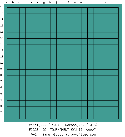 Last move : 0-1 2022 March 17 1:44:33 [Event "FICGS__GO__TOURNAMENT_KYU_II__000074"] [Site "FICGS"] [Date "2022.02.14"] [Round "1"] [Black "Virely,Daniel Francois"] [White "Korossy,Peter"] [Result "0-1"] [Rating 1 "1400"] [Rating 2 "1315"] 0-1 This go game has been lost on time (started : 2022.02.14 23:51:23) Here are the names of the openings (joseki) played in the four corners : Player White won this Go (weiqi, baduk) game. Follow this game move after move (download)When your opponent has two weak groups, attack them both at once. (Anonymous) Pretend inferiority and encourage his arrogance. (Sun Tzu)