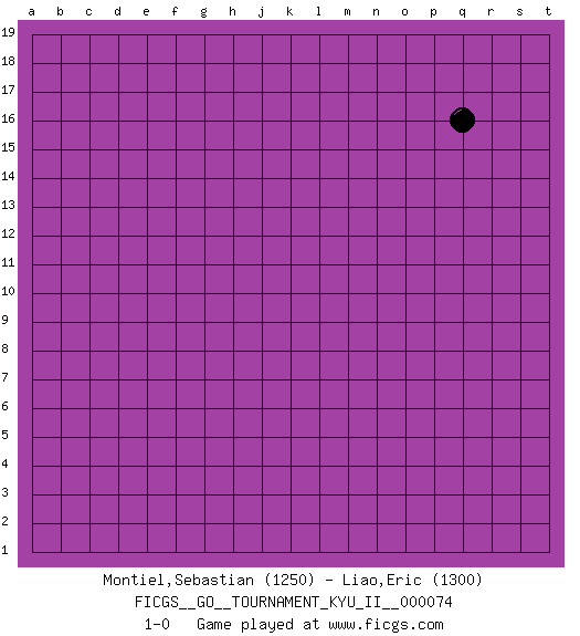 Last move : 1-0 2022 March 17 1:44:33 [Event "FICGS__GO__TOURNAMENT_KYU_II__000074"] [Site "FICGS"] [Date "2022.02.14"] [Round "1"] [Black "Montiel,Sebastian"] [White "Liao,Eric"] [Result "1-0"] [Rating 1 "1250"] [Rating 2 "1300"] 1.q16 1-0 This go game has been lost on time (started : 2022.02.14 23:51:23) Here are the names of the openings (joseki) played in the four corners : Player Black won this Go (weiqi, baduk) game. Follow this game move after move (download)Always remember, keep the balance. [between territory and influence] (Figaro) The message for business people contemplating their place in the cyberspace is simple and direct: get linked or get lost. (Vic Sussman and Kenan Pollack)