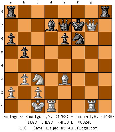 Last move : 1-0 2022 March 23 12:54:37 [Event "FICGS__CHESS__RAPID_E__000246"] [Site "FICGS"] [Date "2022.02.15"] [Round "1"] [White "Dominguez Rodriguez,Yosvany"] [Black "Joubert,Hennie"] [Result "1-0"] [WhiteElo "1763"] [BlackElo "1438"] 1.e4 c5 2.Nc3 Nc6 3.Nf3 e6 4.d4 cxd4 5.Nxd4 d6 6.Be3 a6 7.g4 h6 8.Qd2 Nf6 9.f3 Be7 10.O-O-O Qc7 11.h4 Ne5 12.Rg1 b5 13.g5 hxg5 14.hxg5 Nfd7 15.f4 Nc4 16.Bxc4 Qxc4 17.b3 Qc7 18.g6 Nf6 19.e5 dxe5 20.gxf7+ Kxf7 21.fxe5 Qxe5 22.Nc6 Qc7 23.Nxe7 Qxe7 24.Qg2 Bd7 25.Qxg7+ 1-0 Sicilian : Closed, 2...Nc6 Queenside Castling by player White (move 10) Player White won this chess game. Follow this game move after move (download)Nowadays, when you're not a grandmaster at 14, you can forget about it. (Anand Viswanathan) Ein Gewinn durch eine ungenaue Kombination, sei sie auch noch so vorzeigbar, erfüllt mich mit Schaudern. (Wilhelm Steinitz) El ganar no lo es todo... pero el perder es nada. (Mednis) Le thème de l'attaque double intervient d'une manière ou d'une autre dans l'immense majorité des combinaisons. (Youri Averbakh) An expert is a man who has made all the mistakes which can be made in a very narrow field. (Niels Bohr)