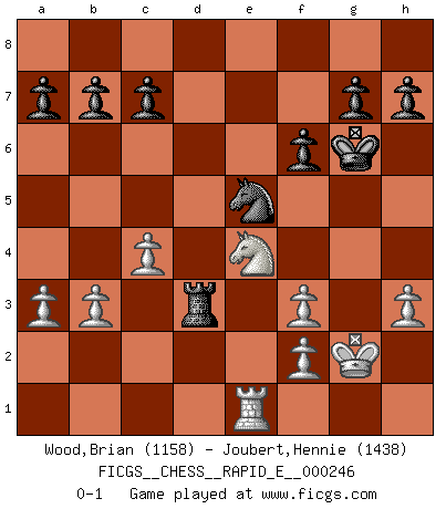Last move : 0-1 2022 May 7 16:35:2 [Event "FICGS__CHESS__RAPID_E__000246"] [Site "FICGS"] [Date "2022.02.15"] [Round "1"] [White "Wood,Brian"] [Black "Joubert,Hennie"] [Result "0-1"] [WhiteElo "1158"] [BlackElo "1438"] 1.d4 d5 2.c4 e5 3.dxe5 d4 4.a3 Nc6 5.Nf3 Nge7 6.e3 dxe3 7.Qxd8+ Kxd8 8.Bxe3 Bg4 9.Be2 Ng6 10.Bg5+ Be7 11.Bxe7+ Kxe7 12.O-O Ngxe5 13.Nc3 Nxf3+ 14.Bxf3 Bxf3 15.gxf3 Ne5 16.Rfe1 Kf6 17.Ne4+ Kg6 18.Kg2 Rhe8 19.b3 Rad8 20.Rad1 f6 21.Rxd8 Rxd8 22.h3 Rd3 0-1 This chess game has been lost on time (started : 2022.02.15 8:57:50) QGD : Albin counter-gambit Kingside Castling by player White (move 12) Player Black won this chess game. Follow this game move after move (download)I won't play with you anymore. You have insulted my friend. - When an opponent cursed himself for a blunder. (Miguel Najdorf) Ich bin es gewohnt, das die Jugend mir überhaupt keinen Respekt entgegenbringt. (Alexander Morozewich) ¡Examina movidas que hagan daño! Un buen ojo for movidas desvastantes es mucho mas importante que el conocimiento de principios estratégicos. (Purdy) Même si vous avez un bon coup à faire, regardez toujours s'il n'y en a pas un qui lui soit préférable. (Pedro Damiano) If things go wrong, don't go with them. (Roger Babson)