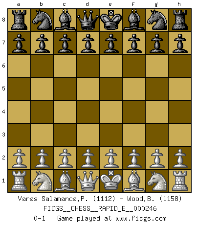 Last move : 0-1 2022 March 17 13:49:50 [Event "FICGS__CHESS__RAPID_E__000246"] [Site "FICGS"] [Date "2022.02.15"] [Round "1"] [White "Varas Salamanca,Pablo"] [Black "Wood,Brian"] [Result "0-1"] [WhiteElo "1112"] [BlackElo "1158"] 0-1 This chess game has been lost on time (started : 2022.02.15 8:57:50) Player Black won this chess game. Follow this game move after move (download)It is peculiar but a fact nevertheless, that gamblers in chess always have enthusiastic followers. (Botvinnik) Ich hatte meine größten Erfolge, als ich 47 Jahre alt war. Kasparow war noch nicht mal 42 und hat das Schach schon im Stich gelassen. (Viktor Kortschnoi) Cuando no sepas que mover, espera por una idea que se le venga a la la cabeza de tu oponente. Tenlo por seguro de que esa idea estará incorrecta. (Siegbert Tarrasch) Les ravages du H expliquent la différence de niveau entre Tal et Thal [Abergel]. To send light into the darkness of men's hearts - such is the duty of the artist. (Schumann)
