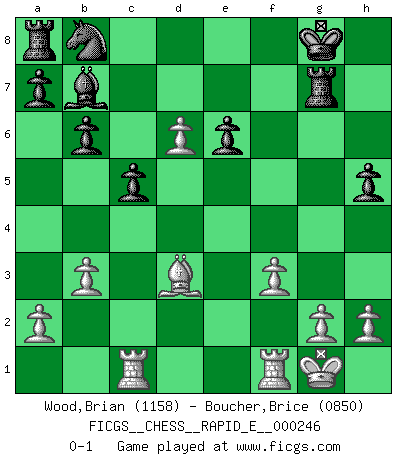 Last move : 0-1 2022 April 20 12:25:58 [Event "FICGS__CHESS__RAPID_E__000246"] [Site "FICGS"] [Date "2022.02.15"] [Round "1"] [White "Wood,Brian"] [Black "Boucher,Brice"] [Result "0-1"] [WhiteElo "1158"] [BlackElo "0850"] 1.d4 Nf6 2.c4 e6 3.Nc3 b6 4.e4 Bb7 5.f3 d6 6.Bd3 g6 7.Bg5 h6 8.Be3 Bg7 9.Nge2 Qe7 10.O-O O-O 11.Rc1 c5 12.d5 exd5 13.Nxd5 Nxd5 14.cxd5 Bxd5 15.b3 Bb7 16.Qd2 Kh7 17.Nf4 Qd7 18.Nh5 gxh5 19.e5 Kh8 20.Bxh6 Rg8 21.Bxg7+ Rxg7 22.Qh6+ Kg8 23.exd6 Qe6 24.Qxe6 fxe6 0-1 This chess game has been lost on time (started : 2022.02.15 8:57:50) Queen's pawn game Kingside Castling by player White (move 10) Kingside Castling by player Black (move 10) Player Black won this chess game. Follow this game move after move (download)Those who say they understand Chess, understand nothing. (Robert Hubner) Schach ist ein Kampf gegen den Fehler. (Johannes Herrman Zukertort) Es muy difícil jugar en contra de la teoría de Einstein. - en su primera derrota en contra de Fischer (Mikhail Tal) Une platitude souvent récitée à propos des Echecs est qu'une des choses les plus difficiles à réaliser est de gagner une position gagnante. Cela ne manque pas de sens mais, pour ma part, j'ai toujours trouvé plus difficile de gagner une position perdante. (Tim Krabbe) Logic : The art of thinking and reasoning in strict accordance with the limitations and incapacities of the human misunderstanding. (Ambrose Bierce)