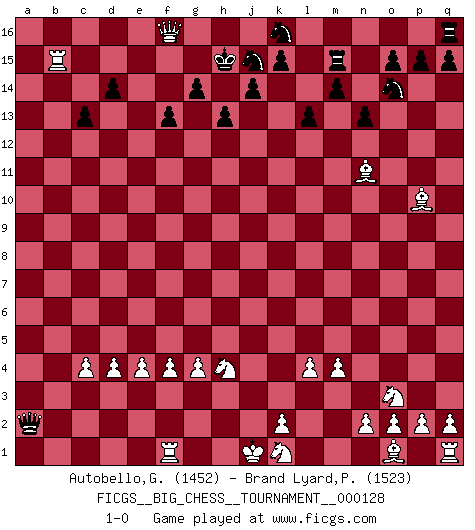 Last move : 1-0 2022 April 20 4:35:56 [Event "FICGS__BIG_CHESS__TOURNAMENT__000128"] [Site "FICGS"] [Date "2022.02.15"] [Round "1"] [White "Autobello,Giovanni"] [Black "Brand Lyard,Paul"] [Result "1-0"] [WhiteElo "1452"] [BlackElo "1523"] 1.d2-d4 h15-g13 2.c1-o12 m15-m14 3.g2-g4 l16-o13 4.c2-c4 d15-d14 5.h1-a8 g15-g14 6.m2-m4 o13-b1 7.a1-b1 c16-o5 8.l2-l4 o5-k1 9.h2-k1 n15-n13 10.o12-n11 l15-l13 11.l1-p5 h14-h13 12.p5-g13 f15-f14 13.g13-j15 g16-j15 14.e2-e4 f16-h14 15.e1-e3 f14-f13 16.e3-b3 b15-b14 17.p1-o3 o16-n15 18.m1-m3 n15-q12 19.f2-f4 q12-f2 20.g1-e2 h14-c9 21.h3-h4 e16-f16 22.f1-p10 p16-o14 23.b1-f1 c9-h4 24.j3-h4 f2-h4 25.j2-h4 a15-a13 26.m3-k3 m16-m15 27.a8-j8 c15-c14 28.b3-b14 c14-c13 29.j8-a16 b16-d15 30.a16-a13 d15-b14 31.a13-b14 f16-b16 32.b14-c15 b16-b2 33.e2-c3 b2-c2 34.c15-e15 c2-c3 35.k3-c3 h16-a9 36.e15-f16 j16-h15 37.c3-b3 a9-a2 38.b3-b15 1-0 Follow this game move after move (download)Strategy requires thought, tactics require observation. (Max Euwe) Im Spitzenschach von heute geht es nur um Vorbereitung, um tiefgründige, sorgfältige Eröffnungsvorbereitung. (Nigel Short) La mitad de las variaciones que son calculadas en una partida de torneo, resultan ser completamente superfluas. Desafortunadamente, nadie sabe por adelantado cual mitad. (Jan Tinman) Dieu déplace le joueur, et celui-ci la pièce. Quel Dieu derrière Dieu commence donc la trame ? Arturo Perez-Reverte (prix de littérature policière 1993). All battles are fought by scared men who'd rather be someplace else. (John Wayne in the movie In harm's way)