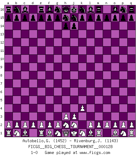 Last move : 1-0 2022 March 21 10:28:58 [Event "FICGS__BIG_CHESS__TOURNAMENT__000128"] [Site "FICGS"] [Date "2022.02.15"] [Round "1"] [White "Autobello,Giovanni"] [Black "Rivenburg,John"] [Result "1-0"] [WhiteElo "1452"] [BlackElo "1143"] 1.k2-k4 1-0 This big chess game has been lost on time (started : 2022.02.15 9:5:43) Follow this game move after move (download)Checkers is for tramps. (Paul Morphy) Capablanka war das größte Genie der Schachgeschichte! Aber denken sie nicht er habe nichts vom Schach verstanden. Er wusste nur soviel wie er wissen musste um seine Ziele zu erreichen. (Mikhail Moiseyevich Botvinik) El ganador de una partida es aquel jugador que hace el penúltimo error. (Savielly Tartakover) La solitude du joueur d'Echecs à l'approche du mat est semblable à celle du condamné. (Francis Szpiner) For to win one hundred victories in one hundred battles is not the acme of skill. To subdue the enemy without fighting is the acme of skill. (Sun Tzu)