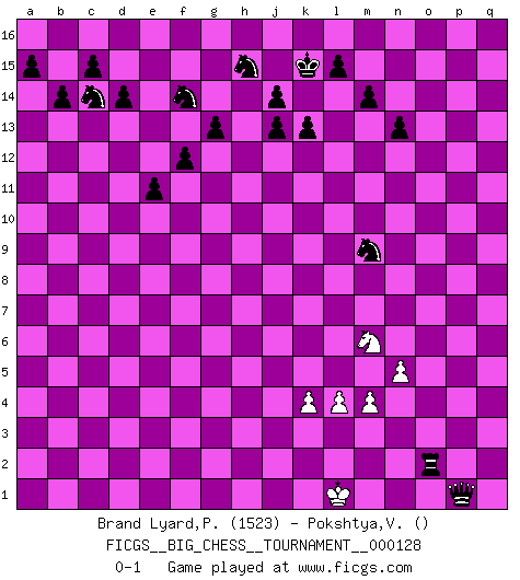 Last move : 0-1 2022 March 29 18:19:23 [Event "FICGS__BIG_CHESS__TOURNAMENT__000128"] [Site "FICGS"] [Date "2022.02.15"] [Round "1"] [White "Brand Lyard,Paul"] [Black "Pokshtya,Vadrya"] [Result "0-1"] [WhiteElo "1523"] [BlackElo ""] 1.j2-k4 n15-n13 2.h1-n6 m16-n16 3.n6-m6 e15-e13 4.m6-b6 h15-j13 5.b6-c5 o16-c5 6.e2-e3 g15-g13 7.f1-b5 k15-k13 8.d2-d4 c5-d6 9.e3-e4 e13-e12 10.e4-e5 d6-g9 11.n2-n3 h16-b10 12.a2-a4 b10-o10 13.c1-e3 o10-o2 14.p2-p4 f16-d14 15.o1-c12 f15-f13 16.c12-g16 j15-g16 17.e3-m10 g16-f14 18.m10-j13 h14-j13 19.e1-e3 k16-h15 20.p1-q3 o2-o13 21.q1-o1 o13-c2 22.b1-a3 c2-b2 23.a1-e1 g9-a3 24.e3-a3 b2-a3 25.o1-o15 p16-o14 26.o15-p15 q16-p16 27.p15-p16 n16-p16 28.m1-p1 d14-q2 29.p1-o1 o14-m13 30.o1-o15 p16-p4 31.o15-q15 q2-m6 32.e1-e3 a3-k12 33.e3-g3 m6-k4 34.j3-k4 p4-k4 35.q15-q16 j16-k15 36.l2-l3 k4-d4 37.g1-f3 k12-j11 38.k1-j3 d4-d1 39.j1-j2 d1-l1 40.q16-l16 e16-l16 41.f3-g5 d15-d14 42.g5-f7 f13-f12 43.q3-o4 c16-h11 44.b5-h11 j11-h11 45.f7-g9 h11-a4 46.f2-f4 a4-f4 47.g3-g7 f4-e5 48.g7-b7 b15-b14 49.b7-o7 b16-c14 50.o7-o15 m15-m14 51.h2-g4 l1-j1 52.j2-k3 e5-k10 53.k3-l4 k10-l9 54.l4-m3 l9-g9 55.n3-n4 l16-o16 56.o15-o16 a16-o16 57.g2-g3 o16-o4 58.h3-h4 j1-j3 59.g4-j3 g9-g3 60.j3-l4 g3-h4 61.k2-k4 m13-l11 62.n4-n5 h4-m8 63.l4-m6 e12-e11 64.l3-l4 l11-m9 65.m3-n3 m8-q4 66.m2-m4 q4-p3 67.n3-m2 o4-o2 68.m2-l1 p3-p1 0-1 Follow this game move after move (download)No other master has such a terrific will to win. At the board he radiates danger, and even the strongest opponents tend to freeze, like rabbits when they smell a panther. Even his weaknesses are dangerous. As white, his opening game is predictable - you can make plans against it - but so strong that your plans almost never work. In the middle game his precision and invention are fabulous, and in the end game you simply cannot beat him. (Anonymous German Expert) Wir irren allesamt, nur jeder irrt anders. (Georg Christoph Lichtenberg) El Ajedrez es el arte del análisis. (Mikhail Botvinnik) Vous savez, camarade Pachman, je n'éprouve pas de plaisir à être ministre, je jouerais plutôt aux échecs comme vous, ou alors ferais une révolution au Venezuela. (Che Guevara à Ludek Pachman, 'Checkmate in Prague', 1975) The Internet is so big, so powerful and pointless that for some people it is a complete substitute for life. (Andrew Brown)