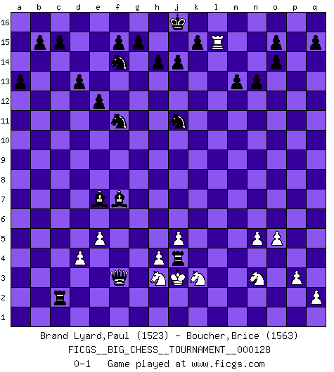 Last move : 0-1 2022 March 16 10:43:31 [Event "FICGS__BIG_CHESS__TOURNAMENT__000128"] [Site "FICGS"] [Date "2022.02.15"] [Round "1"] [White "Brand Lyard,Paul"] [Black "Boucher,Brice"] [Result "0-1"] [WhiteElo "1523"] [BlackElo "1563"] 1.j2-k4 j15-k13 2.h1-m5 h16-o10 3.o2-o3 o10-f2 4.h2-f3 m15-m13 5.e2-e3 f2-q12 6.m5-c5 b16-c14 7.n2-n4 n15-n13 8.o1-d11 o16-c5 9.d2-d4 c5-g9 10.d11-h15 k16-h15 11.e3-e4 d15-d13 12.c1-m10 e15-e13 13.m1-n1 l16-o13 14.f1-d3 f16-c13 15.p1-n2 p16-o14 16.e4-e5 o13-d3 17.c2-d3 g16-f14 18.e1-e4 q12-g3 19.k1-h2 c16-k9 20.e4-g4 g3-o10 21.m10-p13 k9-d3 22.p13-o14 p15-o14 23.m2-m3 a15-a13 24.g4-g9 c13-g9 25.l1-m2 q16-p16 26.p2-p3 e13-e12 27.b2-b3 c14-e13 28.b1-a3 g9-a3 29.a1-d1 d3-k9 30.m2-l3 e16-e14 31.d1-d2 e14-c14 32.k4-m5 c14-c2 33.d2-c2 k9-c2 34.l3-c11 e13-f11 35.c11-f14 h15-f14 36.o3-o4 a16-a14 37.q1-o1 a14-c14 38.o4-o5 c2-b1 39.h2-k3 b1-a2 40.b3-b4 a3-b4 41.j1-j2 c14-c2 42.j2-h2 o10-g10 43.j3-j4 g10-g2 44.h2-j3 g2-k2 45.j3-k4 k2-l2 46.n2-m4 l2-m3 47.o1-o3 m3-g8 48.n1-l1 m16-m14 49.l1-l13 b4-l13 50.o3-l3 l13-f8 51.j4-j5 k13-j11 52.l3-l15 m14-k14 53.k4-j4 a2-f7 54.j4-j3 f8-e7 55.h3-h4 g8-g3 56.g1-h3 p16-p4 57.n4-n5 g3-f3 58.m5-n3 k14-k3 59.m4-k3 p4-j4 0-1 Follow this game move after move (download)Openings teach you openings. Endgames teach you chess ! (Stephan Gerzadowicz) Der Knackpunkt bei der Konzentration ist, daß wir nur durch sie etwas Neues und Ungewöhnliches am Schachbrett finden können. Sie ist der einzige Weg durch neue neue Ideen eine Überraschung zu bereiten. (Garry Kasparov) Una compensación adecuada por un sacrificio es tener una combinación sólida que conduce a una posición ganadora; una compensación adecuada por una metida de pata es dejar a tu oponente arrebatar una derrota de las fauces de la victoria. (Bruce A. Moon) Si rien de grave n'est détecté lors de l'analyse d'une position, on joue alors le coup. Seconde règle de Blumenfeld. The only sure thing about luck is that it will change. (Wilson Mizner)