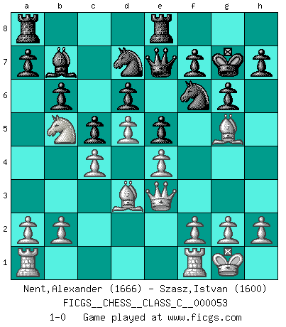 Last move : 1-0 2007 October 13 18:35:11 [Event "FICGS__CHESS__CLASS_C__000053"] [Site "FICGS"] [Date "2007.07.29"] [Round "1"] [White "Nent,Alexander"] [Black "Szasz,Istvan"] [Result "1-0"] [WhiteElo "1666"] [BlackElo "1600"] 1.d4 e6 2.c4 b6 3.e4 Bb7 4.Bd3 c5 5.d5 e5 6.Nc3 d6 7.Nge2 Nf6 8.O-O Be7 9.Ng3 Nbd7 10.Nf5 O-O 11.Qf3 g6 12.Nxe7+ Qxe7 13.Bg5 Kg7 14.Qe3 Rfe8 15.Nb5 1-0 Queen's pawn : Keres defense Kingside Castling by player White (move 8) Kingside Castling by player Black (move 10) Player White won this chess game. Follow this game move after move (download)In Fischer's hands, a slight theoretical advantage is as good a being a Queen ahead. (Isaac Kashdan) Irgendwie scheint mir sonntags früh um 9 Uhr der Killerinstinkt verloren gegangen zu sein. (Alexej Shirov) Un jugador que es sorprendido, esta derrotado a medias. (Proverbio) Dans le domaine de la peinture, de la gravure et de la sculpture, dès la première décennie de notre siècle, les artistes abandonnent la représentation de la partie d'échecs pour se concentrer sur les pièces, sur les échiquiers et sur toutes les variations auxquelles les unes et les autres peuvent donner lieu. On passe en quelque sorte d'un thème social à un thème musical (au sens de la musica médiévale, c'est-à-dire d'une notion qui inclue le rythme, l'harmonie, la construction et la déconstruction, etc.). Graphiquement et picturalement, l'échiquier apparaît comme une structure ouverte, dynamique, d'une richesse infinie, autorisant toutes les combinatoires et débouchant sur des mouvements et des rythmes de nature exponentielle. (Michel Pastoureau) Imagination is more important than knowledge. Knowledge is limited. Imagination encircles the world. (Albert Einstein)