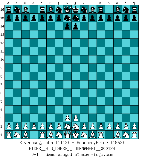 Last move : 0-1 2022 March 17 13:49:50 [Event "FICGS__BIG_CHESS__TOURNAMENT__000128"] [Site "FICGS"] [Date "2022.02.15"] [Round "1"] [White "Rivenburg,John"] [Black "Boucher,Brice"] [Result "0-1"] [WhiteElo "1143"] [BlackElo "1563"] 0-1 This big chess game has been lost on time (started : 2022.02.15 9:5:43) Follow this game move after move (download)My style is somewhere between that of Tal and Petrosian. (Reshevsky) Alle Schachspieler sollten auch ein Hobby haben. (Savielly Grigorievitsch Tartakower) Solo el jugador con la iniciativa tiene el derecho a atacar. (Wilhelm Steinitz) Nous vivons dans un monde échiquéen : chaque jour qui passe est un défi à relever. (Philosophe Sasha) I teach you to lie, cheat and steal, and as soon as my back's turned you wait in line ? (Gregory House, House M.D.)