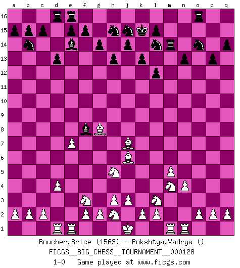 Last move : 1-0 2022 March 28 18:34:52 [Event "FICGS__BIG_CHESS__TOURNAMENT__000128"] [Site "FICGS"] [Date "2022.02.15"] [Round "1"] [White "Boucher,Brice"] [Black "Pokshtya,Vadrya"] [Result "1-0"] [WhiteElo "1563"] [BlackElo ""] 1.j2-k4 d15-d13 2.h1-o7 g15-g14 3.o7-o15 c16-k9 4.o15-h9 k9-e14 5.n2-n4 h16-d12 6.m2-m4 m15-m13 7.l1-n3 n15-n13 8.m4-m5 d12-l12 9.h9-l12 m13-l12 10.e2-e4 o16-c5 11.n3-k6 p16-o14 12.g1-f3 f16-g15 13.d2-d4 c5-h10 14.p1-o3 l16-o13 15.o1-j6 k16-l14 16.f1-d3 b16-d15 17.b1-c3 k15-k13 18.e4-e5 j16-k15 19.d3-o13 p15-p14 20.o13-h7 h14-h13 21.c1-p13 m16-m14 22.q1-n1 q15-q14 23.p13-j7 d15-b14 24.a1-d1 a16-d16 25.c3-e4 g15-m10 26.e4-f6 m10-j7 27.k6-j7 g16-h14 28.k4-h5 p14-p13 29.f6-g8 h10-f8 30.k1-l3 q16-o16 31.o3-m4 h14-j12 32.e5-e6 j12-h10 33.e6-e7 h10-g8 34.h7-g8 1-0 Follow this game move after move (download)If cunning alone were needed to excel, women would be the best Chess players. (Albin) Fischer: 'Remis!?' Uhlmann: 'Aber es muss doch dreimal Zugwiederholung sein!' Fischer: 'Sie nehmen das Remis an, wie ich es sage, sonst spiele ich weiter und werde Sie dann schlagen!' (Robert James Fischer) Jugadores de primera clase pierden en contra de jugadores de segunda clase porque los jugadores de segunda clase a veces juegan una partida de primer clase. (Siegbert Tarrasch) Les réformistes prétendent que les progrès de la théorie conduiront à la disparition des échecs, et qu'il faut, pour leur rendre vie, en remanier les règles. En réalité, qu'exprime cette affirmation? Le mépris de l'intuition, de l'imagination et de tous les autres éléments qui font des échecs un art. (Alexander Alekhine) Heh, heh, heh. Time to abandon ship. (General Grievous in Star Wars ep.3)