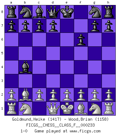 Last move : 1-0 2022 February 23 2:55:59 [Event "FICGS__CHESS__CLASS_F__000233"] [Site "FICGS"] [Date "2022.02.15"] [Round "1"] [White "Goldmund,Heike"] [Black "Wood,Brian"] [Result "1-0"] [WhiteElo "1417"] [BlackElo "1158"] 1.b4 e5 2.Bb2 Bxb4 3.Bxe5 f6 4.Bb2 1-0 Polish (Sokolsky) opening Player White won this chess game. Follow this game move after move (download)I played Chess with him and would have beaten him sometimes only he always took back his last move, and ran the game out differently. (Mark Twain) Schach verlangt totale Konzentration. (Robert James Fischer) Tu sabes que vas a perder. Aún cuando tenía la ventaja, yo sabía que iba a perder. - al estar jugando con Fischer (Andrew Soltis) Celui qui prend des risques peut perdre, celui qui n'en prend pas perd toujours. (Xavier Tartacover) Somewhere in the world there is an epigram for every dilemma. (Hendrik Willem van Loon)