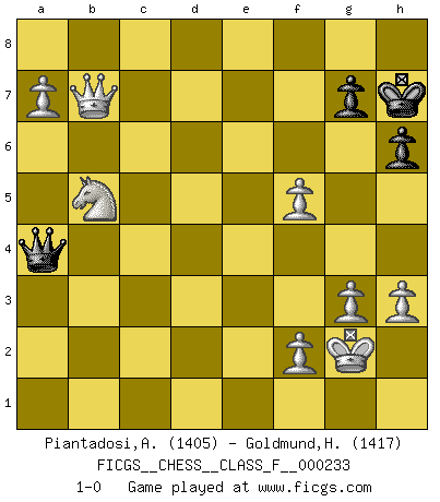 Last move : 1-0 2022 June 5 7:48:28 [Event "FICGS__CHESS__CLASS_F__000233"] [Site "FICGS"] [Date "2022.02.15"] [Round "1"] [White "Piantadosi,Angelo"] [Black "Goldmund,Heike"] [Result "1-0"] [WhiteElo "1405"] [BlackElo "1417"] 1.d4 Nf6 2.c4 b6 3.Nc3 Bb7 4.Bg5 e6 5.e3 Be7 6.Nf3 O-O 7.Be2 c5 8.O-O d6 9.Rc1 a6 10.b3 Qc7 11.dxc5 bxc5 12.Nd2 Nbd7 13.Bf3 Bxf3 14.Nxf3 h6 15.Bh4 Rfd8 16.Bg3 Nh5 17.Bh4 Bxh4 18.Nxh4 Nhf6 19.Nf3 Ng4 20.h3 Nge5 21.Nxe5 Nxe5 22.Qe2 Qc6 23.Rfd1 Ng6 24.Rd3 Nh4 25.Qf1 d5 26.cxd5 exd5 27.Na4 c4 28.Rdc3 Qg6 29.Kh2 Qd6+ 30.Kh1 a5 31.bxc4 dxc4 32.Qxc4 Qg6 33.Qxh4 Rd2 34.Rc6 Qf5 35.Kg1 Rad8 36.R6c2 Rxc2 37.Qxd8+ Kh7 38.Rxc2 Qxc2 39.Qxa5 Qd1+ 40.Kh2 Qd6+ 41.g3 Qe6 42.Nb6 Qf6 43.Kg2 Qc6+ 44.Kh2 Qc2 45.Kg1 Qb1+ 46.Kh2 Qc2 47.Kg2 Qc6+ 48.Nd5 Qb7 49.e4 Qb2 50.a4 Qc2 51.Qb4 Qe2 52.a5 Qa2 53.Nc3 Qe6 54.Qb7 Qc4 55.Nb5 Qa2 56.a6 f5 57.exf5 Qa4 58.a7 1-0 Queen's Indian Accelerated Kingside Castling by player Black (move 6) Kingside Castling by player White (move 8) Player White won this chess game. Follow this game move after move (download)The game of Chess is not merely an idle amusement; several very valuable qualities of the mind are to be acquired and strengthened by it, so as to become habits ready on all occasions; for life is a kind of Chess. (Benjamin Franklin) Kasparov ist eine Art Monster mit hundert Augen, denen auch nicht das Geringste entgeht. (Tony Miles) El poder defensivo de una pieza clavada, solamente es imaginario. (Aaron Nimzovich) L'ordinateur a tué l'originalité. Il n'y a plus guère d'aventures sur l'échiquier. (Jacob Murray) Opportunities multiply as they are seized. (Sun Tzu)
