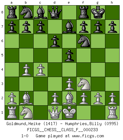 Last move : 1-0 2022 April 3 23:21:6 [Event "FICGS__CHESS__CLASS_F__000233"] [Site "FICGS"] [Date "2022.02.15"] [Round "1"] [White "Goldmund,Heike"] [Black "Humphries,Billy"] [Result "1-0"] [WhiteElo "1417"] [BlackElo "0995"] 1.b4 e5 2.Bb2 d6 3.e3 Nf6 4.c4 Be7 5.Nf3 O-O 6.Be2 1-0 This chess game has been lost on time (started : 2022.02.15 9:11:32) Polish (Sokolsky) opening Kingside Castling by player Black (move 5) Player White won this chess game. Follow this game move after move (download)Chess is like life. (Boris Spassky) Ich organisiere ein großes Turnier, was mich etwa 120000 Dollar kostet. Ich denke, das ist das erste Mal in der Schachgeschichte, daß ein Schachgroßmeister auch als Mäzen auftritt. (Miguel Najdorf) Si tu oponente te ofrece un empate, trata de averiguar porque piensa él que esta en una posición peor. (Nigel Short) J'ai toujours senti une vague pitié pour l'homme qui ne connaît rien aux échecs, tout comme j'en aurais pour un homme ignorant de l'amour. Les Echecs, comme la musique ou comme l'amour, ont le pouvoir de rendre heureux. (Siegbert Tarrasch) Cactus - It is depressed cucumber. (Ilmars Cirulis)