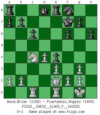 Last move : 0-1 2022 April 11 1:8:11 [Event "FICGS__CHESS__CLASS_F__000233"] [Site "FICGS"] [Date "2022.02.15"] [Round "1"] [White "Wood,Brian"] [Black "Piantadosi,Angelo"] [Result "0-1"] [WhiteElo "1158"] [BlackElo "1405"] 1.d4 d5 2.c4 e6 3.Nc3 Nf6 4.Bg5 Nbd7 5.e3 Be7 6.cxd5 exd5 7.Nf3 O-O 8.Bd3 c6 9.O-O h6 10.Bh4 Re8 11.Rc1 Nf8 12.Bg3 Bd6 13.Re1 Bxg3 14.hxg3 Bg4 15.Be2 Ne4 16.Nxe4 dxe4 17.Ne5 Bxe2 18.Qxe2 f6 19.Nc4 Kf7 0-1 QGD Kingside Castling by player Black (move 7) Kingside Castling by player White (move 9) Player Black won this chess game. Follow this game move after move (download)No one ever won a game by resigning. (Unknown) Die FIDE ist dabei in die Hände der russischen Mafia zu fallen. (Larry Evans) Por esta medida (el intervalo entre Fischer y sus contemporaneos), yo le considero el mas grande campeón mundial. (Garry Kasparov) Ce n'est pas pour s'amuser qu'il joue aux échecs : il célèbre un culte. (Vladimir Nabokov) Fame, I have already. Now I need the money. (an elderly Steinitz)