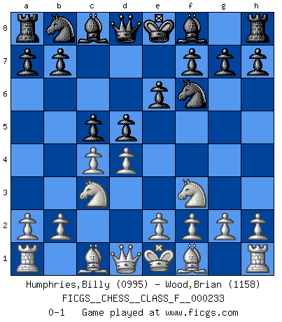 Last move : 0-1 2022 March 31 4:1:1 [Event "FICGS__CHESS__CLASS_F__000233"] [Site "FICGS"] [Date "2022.02.15"] [Round "1"] [White "Humphries,Billy"] [Black "Wood,Brian"] [Result "0-1"] [WhiteElo "0995"] [BlackElo "1158"] 1.d4 d5 2.c4 e6 3.Nf3 c5 4.Nc3 Nf6 0-1 This chess game has been lost on time (started : 2022.02.15 9:11:32) Queen's gambit declined Player Black won this chess game. Follow this game move after move (download)I still hope to kill Fischer. (Boris Spassky) Stil? Ich habe keinen Stil! (Anatoly Karpov) El Ajedrez tiene tanto misterio como las mujeres. (Purdy) Fischer est le meilleur joueur du monde et Karpov n'est qu'un joueur de bistrot. (Garry Kasparov, agé de 16 ans) Luck is what you have left over after you give 100 percent. (Langston Coleman)
