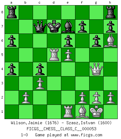 Last move : 1-0 2007 July 31 1:11:59 [Event "FICGS__CHESS__CLASS_C__000053"] [Site "FICGS"] [Date "2007.07.29"] [Round "1"] [White "Wilson,Jaimie"] [Black "Szasz,Istvan"] [Result "1-0"] [WhiteElo "1676"] [BlackElo "1600"] 1.d4 e6 2.Nf3 b6 3.e4 Bb7 4.Bd3 c5 5.c3 d6 6.O-O Be7 7.Na3 a6 8.Re1 b5 9.Nc2 c4 10.Bf1 Nf6 11.e5 Nd5 12.Ne3 dxe5 13.Nxe5 Nd7 14.Nxd5 Bxd5 15.Qg4 Nxe5 16.dxe5 g6 17.Bh6 Kd7 18.a4 Qc7 19.Rad1 bxa4 20.Rxd5+ 1-0 Queen's pawn Kingside Castling by player White (move 6) Player White won this chess game. Follow this game move after move (download)Chess teaches you to control the initial excitement you feel when you see something that looks good and it trains you to think objectively when you're in trouble. (Stanley Kubrick) Als er Schachweltmeister wurde ließ er praktisch alle stärksten Sovietspieler für sich arbeiten. Wenn ein auch nur mittelmässiger Meister ein Spezialist für eine bestimmte Eröffnung war, wurde er von Karpov gerufen. Das wurde alles geheim gehalten. (Mikhail Moiseyevich Botvinik) Aún el Rey más flojo huye despavorido ante la amenaza de un Jaque doble. (Aaron Nimzowitsch) A chaque perte on perd un peu de soi. (Joël Lautier) Computers are like Old Testament gods; lots of rules and no mercy. (Joseph Campbell)