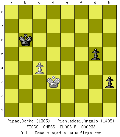 Last move : 0-1 2022 May 25 18:7:51 [Event "FICGS__CHESS__CLASS_F__000233"] [Site "FICGS"] [Date "2022.02.15"] [Round "1"] [White "Pipac,Darko"] [Black "Piantadosi,Angelo"] [Result "0-1"] [WhiteElo "1305"] [BlackElo "1405"] 1.e4 e6 2.d4 d5 3.exd5 exd5 4.a3 Bd6 5.Nc3 c6 6.h3 Ne7 7.Nf3 O-O 8.Bd3 Bf5 9.Bg5 f6 10.Bxf5 Nxf5 11.Be3 Re8 12.Qd2 Nxe3 13.fxe3 Nd7 14.O-O-O Nf8 15.Rde1 Ne6 16.g4 Qa5 17.Ne4 Qxd2+ 18.Nexd2 b6 19.Rhf1 c5 20.Rf2 Bg3 21.R2f1 Bxe1 22.Rxe1 cxd4 23.e4 dxe4 24.Nxe4 Nc5 25.Nxc5 bxc5 26.Kd2 Rxe1 27.Nxe1 Kf7 28.Nd3 Rc8 29.c4 Ke6 30.Ke2 f5 31.Kf3 fxg4+ 32.hxg4 g5 33.Ke4 Rf8 34.Nxc5+ Kd6 35.Kxd4 Rf4+ 36.Ne4+ Kc6 37.b4 Rxg4 38.b5+ Kb6 39.Kd5 Rxe4 40.Kxe4 Kc5 41.Kd3 h5 42.a4 h4 43.a5 h3 44.b6 axb6 45.axb6 Kxb6 0-1 French : Exchange variation Kingside Castling by player Black (move 7) Queenside Castling by player White (move 14) 10 pieces endgame at move 37 : White KNPPP , Black KRPPP WHITE : King + 1 Knight 3 Pawns BLACK : King + 1 Rook 3 Pawns 9 pieces endgame at move 39 : White KPPP , Black KRPPP WHITE : King + 3 Pawns BLACK : King + 1 Rook 3 Pawns 8 pieces endgame at move 40 : White KPPP , Black KPPP WHITE : King + 3 Pawns BLACK : King + 3 Pawns 7 pieces endgame at move 44 : White KPP , Black KPPP WHITE : King + 2 Pawns BLACK : King + 3 Pawns 6 pieces endgame at move 45 : White KPP , Black KPP WHITE : King + 2 Pawns BLACK : King + 2 Pawns 5 pieces endgame at move 45 : White KP , Black KPP WHITE : King + 1 Pawn BLACK : King + 2 Pawns Player Black won this chess game. Follow this game move after move (download)The passed Pawn is a criminal, who should be kept under lock and key. Mild measures, such as police surveillance, are not sufficient. (Aaron Nimzovich) Kleine Schachspieler machen Mist, und große Schachspieler machen Mist, aber große machen weniger Mist. (Fritz Sämisch) Sin errores no puede haber brillantez. (Emanuel Lasker) A ce moment-là, je menaçais de comprendre la position ! (Clément L'Heureux) Experiences are the keys to life. (Daniel Parmet)