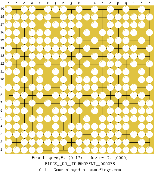 Last move : 0-1 2022 June 27 7:13:20 [Event "FICGS__GO__TOURNAMENT__000098"] [Site "FICGS"] [Date "2022.02.15"] [Round "1"] [Black "Brand Lyard,Paul"] [White "Javier,Christian"] [Result "0-1"] [Rating 1 "0117"] [Rating 2 "0000"] 1.a2 t18 2.t19 s18 3.r16 s19 4.r19 r18 5.r17 q18 6.t17 q19 7.a3 q17 8.p19 s17 9.s16 t16 10.r15 q16 11.a1 s15 12.r14 q15 13.s14 t14 14.t13 s13 15.k10 r13 16.h11 t12 17.n9 q14 18.f6 l9 19.t11 s10 20.t10 t9 21.j9 s11 22.r11 l10 23.l11 m10 24.m9 n10 25.n11 m11 26.m12 o10 27.p10 o9 28.o8 m8 29.n8 n7 30.t8 o7 31.c16 p8 32.q8 q7 33.q6 k8 34.k7 j8 35.l3 j7 36.h6 h8 37.g9 g8 38.f8 e8 39.c13 j6 40.l5 f7 41.e7 f9 42.h9 g10 43.q12 p13 44.g7 h5 45.g15 g5 46.g4 f5 47.f16 e6 48.d6 d7 49.d9 g6 50.f4 e3 51.d3 g11 52.d5 c6 53.p16 f3 54.e2 f2 55.p18 e1 56.d1 g1 57.h1 h12 58.s9 j11 59.p3 h10 60.j10 k11 61.r10 k9 62.j5 h7 63.h13 l12 64.h4 h6 65.e4 d4 66.c4 d2 67.c2 e2 68.g3 h2 69.h3 j1 70.l8 l7 71.k6 k4 72.p15 o14 73.l13 k13 74.k14 c1 75.b18 s8 76.j13 j12 77.l6 b4 78.o12 b5 79.p14 o15 80.o16 o17 81.r2 m13 82.a5 o18 83.t11 r9 84.n4 l14 85.k5 n12 86.b6 b7 87.j4 o19 88.p17 n16 89.g9 h9 90.r16 o11 91.p12 j14 92.b3 a6 93.s7 k15 94.e13 q9 95.h18 p6 96.j2 k2 97.m16 t7 98.k16 h14 99.m6 g13 100.f11 r8 101.g14 j3 102.m5 r12 103.f10 q11 104.b9 o13 105.n13 n14 106.o5 q10 107.t6 s6 108.s5 t5 109.f13 f12 110.e12 e11 111.n19 t10 112.r7 r6 113.d8 c8 114.n17 a4 115.e18 e10 116.d14 d12 117.f17 q5 118.q4 l4 119.n15 m15 120.t4 p11 121.n18 m17 122.l17 l16 123.d10 q13 124.c9 d13 125.e14 k17 126.t3 l18 127.n6 j16 128.h16 p9 129.m1 m18 130.n2 m19 131.a14 c14 132.p2 d15 133.d16 e15 134.e16 l2 135.l19 k19 136.b14 b13 137.b12 c12 138.f19 b15 139.j19 r5 140.r4 m3 141.p4 m4 142.o4 g2 143.k18 j18 144.h19 h17 145.g17 d11 146.h15 f14 147.p5 b16 148.s4 f15 149.e14 e13 150.t1 k3 151.b1 c10 152.c5 d14 153.g16 c17 154.b10 b11 155.c19 o6 156.d19 a15 157.b17 a17 158.q1 b8 159.f18 n3 160.o3 e5 161.l1 a13 162.s3 n1 163.a10 m2 164.a19 o2 165.a8 a12 166.r3 e9 167.q2 a11 168.t2 c15 169.e17 j15 170.d17 a7 171.e19 a16 172.s1 k1 173.b2 a9 174.g18 j17 175.p1 m7 176.d4 t6 177.d18 q6 178.r7 s7 179.m1 a18 180.q3 o1 181.n2 l1 182.c18 n1 183.o2 b6 184.r15 r14 185.o1 m1 186.s16 r17 187.b19 k18 188.r1 a5 189.b14 a14 190.c17 e14 191.d10 d9 192.c3 d1 193.c9 b9 194.s2 n5 195.r2 f13 196.c3 h13 197.d4 e4 198.b1 c4 199.a2 d3 200.b2 d5 201.o3 b3 202.q3 c2 203.s3 a3 204.m5 c3 205.p4 a1 206.p2 m6 207.p16 l5 208.t1 o4 209.p17 p15 210.g4 p18 211.h4 o16 212.b2 p5 213.s4 q4 214.r4 g3 215.p12 a2 216.q1 n4 217.k5 k6 218.j5 j4 219.q12 o12 220.f4 h3 221.n9 b1 222.t4 s5 223.t3 o5 224.t2 n2 225.p3 o2 226.r3 o1 227.s2 g19 228.e17 p1 229.r1 e16 230.q2 n8 231.c19 s1 232.e19 m9 233.t3 e18 234.d17 f17 235.f19 f18 236.b19 d18 237.q2 d16 238.r3 c17 239.j19 d19 240.g18 h18 241.s4 h19 242.b18 g17 243.c18 b17 244.p3 o3 245.g16 a19 246.g15 f16 247.h16 h15 248.s2 g14 249.r4 p4 250.q3 p2 251.r2 r1 252.b19 q1 253.s3 t4 254.t2 t1 255.t2 t3 256.q3 b18 257.r2 s2 258.f4 g4 259.s4 s3 260.r4 r3 261.r4 s4 262.q2 p3 263.c19 c18 264.g16 g15 265.b19 h16 266.e19 f19 267.e17 d17 268.a10 b10 269.r2 q2 270.q12 p12 271.s16 r16 272.j10 c19 273.pass j9 274.pass k10 275.p16 p17 0-1 Here are the names of the openings (joseki) played in the four corners : Corner q16 : t18 t19 This joseki is unknown. A weak or weird move has probably been played in this corner. Corner q4 : n9 l9 This joseki is unknown. A weak or weird move has probably been played in this corner. Player White won this Go (weiqi, baduk) game. Follow this game move after move (download)Those who are good at winning, don't usually fight. (Zhang) God is an atheist. (Unknown)
