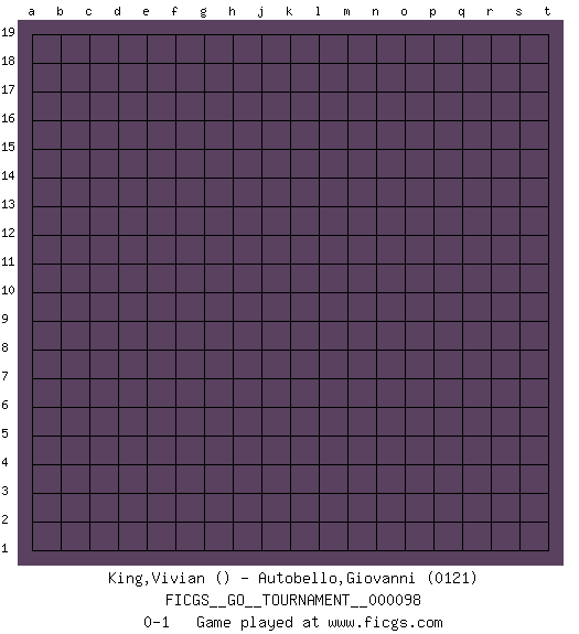 Last move : 0-1 2022 March 17 13:49:50 [Event "FICGS__GO__TOURNAMENT__000098"] [Site "FICGS"] [Date "2022.02.15"] [Round "1"] [Black "King,Vivian"] [White "Autobello,Giovanni"] [Result "0-1"] [Rating 2 "0121"] 0-1 This go game has been lost on time (started : 2022.02.15 9:28:26) Here are the names of the openings (joseki) played in the four corners : Player White won this Go (weiqi, baduk) game. Follow this game move after move (download)The nature of a game comes from what is played, but it's the sensitivity to the possible and the impossible that gives it value. (Pierre Audouard) Nobody is always a winner, and anybody who says he is, is either a liar or doesn't play poker. (Amarillo Slim)
