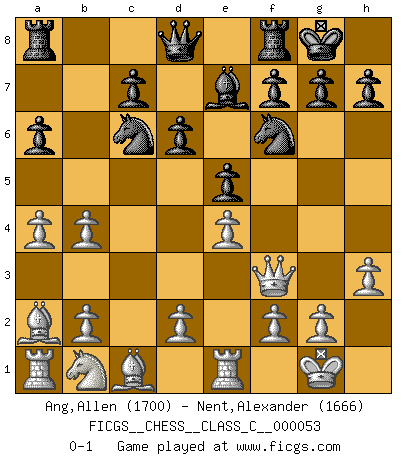 Last move : 0-1 2007 November 16 7:19:10 [Event "FICGS__CHESS__CLASS_C__000053"] [Site "FICGS"] [Date "2007.07.29"] [Round "1"] [White "Ang,Allen"] [Black "Nent,Alexander"] [Result "0-1"] [WhiteElo "1700"] [BlackElo "1666"] 1.e4 e5 2.Nf3 Nc6 3.Bb5 a6 4.Ba4 Nf6 5.O-O Be7 6.Re1 b5 7.Bb3 d6 8.a4 Bg4 9.c3 O-O 10.h3 Bxf3 11.Qxf3 Na5 12.Ba2 b4 13.cxb4 Nc6 0-1 This chess game has been lost on time (started : 2007.07.29 23:39:57) Ruy Lopez : Closed Kingside Castling by player White (move 5) Kingside Castling by player Black (move 9) Player Black won this chess game. Follow this game move after move (download)No one ever won a game by resigning. (Unknown) Garry Kasparov war erst in der Großmeister-Organisation GMA, dann in der Profischach-Vereinigung PCA, zum Schluss kehrte er wieder in den Schoß der FIDE zurück. Aber gut, manche Leute sind flexibel (Viswanathan Anand) Las ideas audaces son como las piezas del Ajedrez que avanzan hacia adelante. Ellas pueden ser vencidas, pero también pueden iniciar una partida victoriosa. (Goethe) Les Echecs ne sont pas pour les âmes timides. Ils requièrent un homme entier, qui ne s'arrête pas aveuglément à ce qui a été déjà établi, mais qui tente individuellement de sonder les profondeurs du jeu. (W. Steinitz) Your best chance to get a Royal Flush in a casino is in the bathroom. (Anonymous)