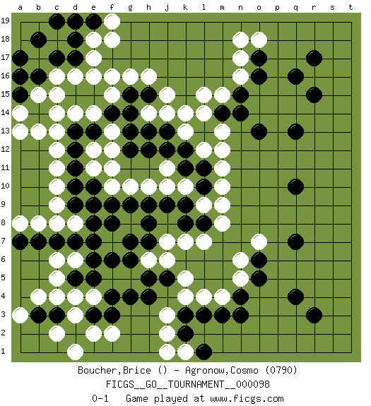 Last move : 0-1 2022 September 11 8:57:14 [Event "FICGS__GO__TOURNAMENT__000098"] [Site "FICGS"] [Date "2022.02.15"] [Round "1"] [Black "Boucher,Brice"] [White "Agronow,Cosmo"] [Result "0-1"] [Rating 2 "0790"] 1.q16 d4 2.q10 c16 3.q4 n17 4.o17 n16 5.n15 m15 6.f4 f5 7.g4 g5 8.h5 h6 9.h4 j6 10.m14 l15 11.o16 k10 12.c3 c4 13.e5 e4 14.e6 e7 15.g6 g7 16.f6 f7 17.d5 c5 18.j5 k5 19.d7 d8 20.c7 k4 21.e8 c8 22.b7 b8 23.a7 a8 24.f8 g8 25.f9 f10 26.g9 g10 27.h9 h10 28.j9 j10 29.k9 l9 30.k8 l7 31.e10 e11 32.d10 c10 33.d11 k7 34.h7 j7 35.h8 j3 36.e3 d3 37.f3 c6 38.d2 c2 39.c17 c11 40.d12 e12 41.d13 e14 42.e13 f13 43.b3 e2 44.l8 m8 45.g7 m9 46.f14 f15 47.g14 h14 48.e15 d14 49.d15 c14 50.g15 f16 51.e16 e17 52.c15 b15 53.g13 f12 54.g12 f11 55.b14 c13 56.b16 d16 57.n3 d1 58.q7 h16 59.h15 j15 60.h13 j14 61.j13 k13 62.k12 l12 63.l13 k14 64.l11 m12 65.l10 m10 66.k11 m11 67.j12 g16 68.h12 j11 69.r3 m13 70.n14 l14 71.o13 f2 72.r17 o18 73.b18 c12 74.d9 c9 75.e9 d6 76.e7 n18 77.d18 e18 78.e19 f19 79.d19 f18 80.a15 c15 81.d17 e16 82.a17 b13 83.a16 a14 84.c19 b4 85.r15 a13 86.l3 a3 87.q13 n5 88.o5 n6 89.o6 o7 90.n4 m4 91.m3 l4 92.k3 j2 93.k2 k1 94.l1 j1 0-1 Here are the names of the openings (joseki) played in the four corners : Corner q16 : q16 n17 Hoshi (Hwajeom, Seongjeom, Xingwei`) 4-4 Point. The star or hoshi (4-4) point, emphasizing influence at the potential expense of territory. Niken Kakari (Dukan Keolch'im, E`r Gua`jiao~, 2-Space Low Approach). Black typically answers by 7-3 or 3-5 (which is not joseki). Corner d4 : d4 f4 Hoshi (Hwajeom, Seongjeom, Xingwei`) 4-4 Point. The star or hoshi (4-4) point, emphasizing influence at the potential expense of territory. Ikken Takagakari (Hankan Nop'dakeolch'im, Yi Gaojia, 1-Space High Approach). White typically responds at 6-4 or 3-10. White 4-10 is played when White finds play on the right side advantageous. White 4-8 or 3-8 may be played when White has support at top. Corner q4 : q4 l9 Hoshi (Hwajeom, Seongjeom, Xingwei`) 4-4 Point. The star or hoshi (4-4) point, emphasizing influence at the potential expense of territory. Player White won this Go (weiqi, baduk) game. Follow this game move after move (download)The intersection is rarely neutral. (Pierre Audouard) Chess, like love, like music, has the power to make people happy. (Siegbert Tarrasch)