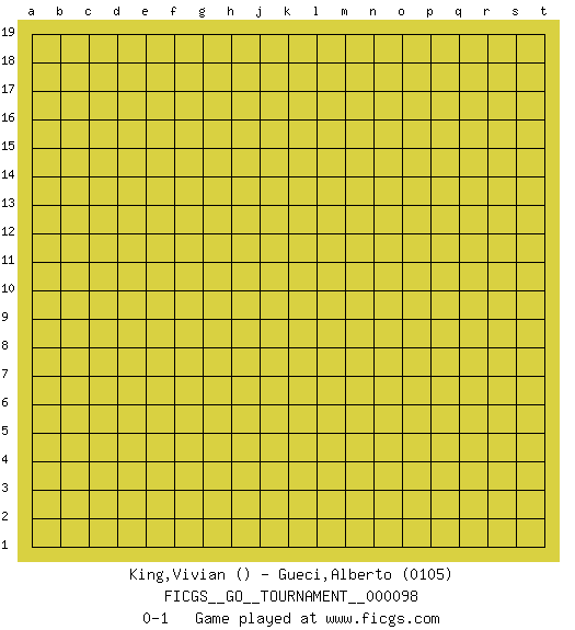 Last move : 0-1 2022 March 17 13:49:50 [Event "FICGS__GO__TOURNAMENT__000098"] [Site "FICGS"] [Date "2022.02.15"] [Round "1"] [Black "King,Vivian"] [White "Gueci,Alberto"] [Result "0-1"] [Rating 2 "0105"] 0-1 This go game has been lost on time (started : 2022.02.15 9:28:26) Here are the names of the openings (joseki) played in the four corners : Player White won this Go (weiqi, baduk) game. Follow this game move after move (download)The comb formation is alive. (Anonymous) Wisdom is the reward you get for a lifetime of listening when you'd have preferred to talk. (Doug Larson)
