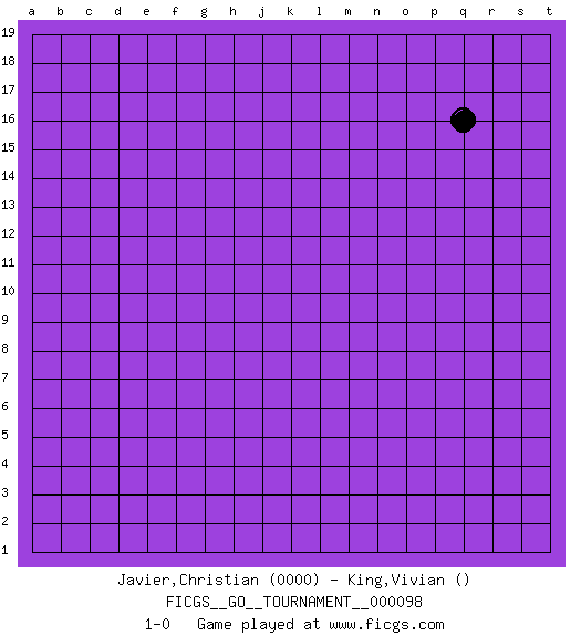 Last move : 1-0 2022 March 21 23:35:4 [Event "FICGS__GO__TOURNAMENT__000098"] [Site "FICGS"] [Date "2022.02.15"] [Round "1"] [Black "Javier,Christian"] [White "King,Vivian"] [Result "1-0"] [Rating 1 "0000"] 1.q16 1-0 This go game has been lost on time (started : 2022.02.15 9:28:26) Here are the names of the openings (joseki) played in the four corners : Player Black won this Go (weiqi, baduk) game. Follow this game move after move (download)A meijin needs no joseki. (Anonymous) Lamb in skin of tiger, still fears the wolf. (Chinese proverb)