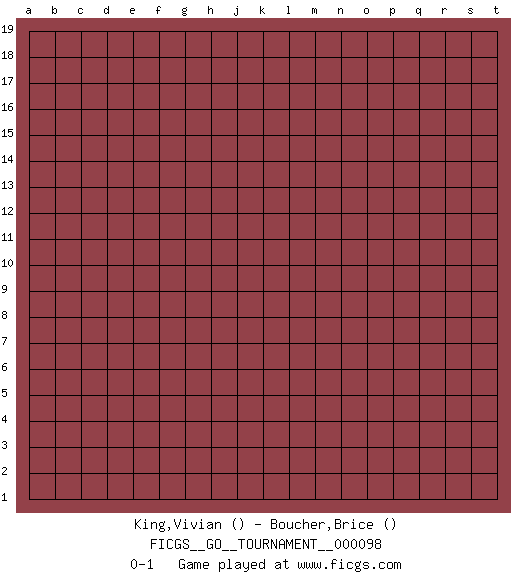 Last move : 0-1 2022 March 17 13:49:50 [Event "FICGS__GO__TOURNAMENT__000098"] [Site "FICGS"] [Date "2022.02.15"] [Round "1"] [Black "King,Vivian"] [White "Boucher,Brice"] [Result "0-1"] 0-1 This go game has been lost on time (started : 2022.02.15 9:28:26) Here are the names of the openings (joseki) played in the four corners : Player White won this Go (weiqi, baduk) game. Follow this game move after move (download)Josekis are not fixed, definitive things. They indicate the moments when everything can change. (Pierre Audouard) In my experience, there's no such thing as luck. (Obi-Wan Kenobi in Star Wars ep.4)