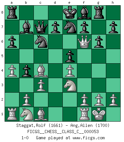 Last move : 1-0 2007 December 2 20:7:7 [Event "FICGS__CHESS__CLASS_C__000053"] [Site "FICGS"] [Date "2007.07.29"] [Round "1"] [White "Staggat,Rolf"] [Black "Ang,Allen"] [Result "1-0"] [WhiteElo "1661"] [BlackElo "1700"] 1.e4 c5 2.Nf3 e6 3.d4 cxd4 4.Nxd4 a6 5.Bd3 Qc7 6.O-O b5 7.a4 e5 8.Nf5 b4 9.c3 Nc6 10.Qg4 g6 11.Ne3 Nge7 12.Qf3 Bb7 13.Qf6 Rg8 14.Bc4 1-0 This chess game has been lost on time (started : 2007.07.29 23:39:57) Sicilian : Kan, 5.Bd3 Kingside Castling by player White (move 6) Player White won this chess game. Follow this game move after move (download)The way he plays Chess demonstrates a man's whole nature. (Stanley Ellin) Man braucht nicht immer den besten Zug zu spielen: Ein Zug muß aktiv, unternehmungslustig, korrekt und schön sein. (David Bronstein) Una partida de Ajedrez se divide en 3 etapas: la primera cuando piensas que tienes la ventaja, la segunda cuando crees que tienes la ventaja y la tercera... ¡cuando te das cuenta que vas a perder!. (Savielly Tartakower) Comme les marins qui ont mille raisons différentes d'aller en mer, les joueurs d'échecs en ont tout autant avant de s'installer devant une table et jouer... (Vincent Bertignac, philosophe) The only thing that matters is the evidence. (Horatio Caine, C.S.I. Miami)