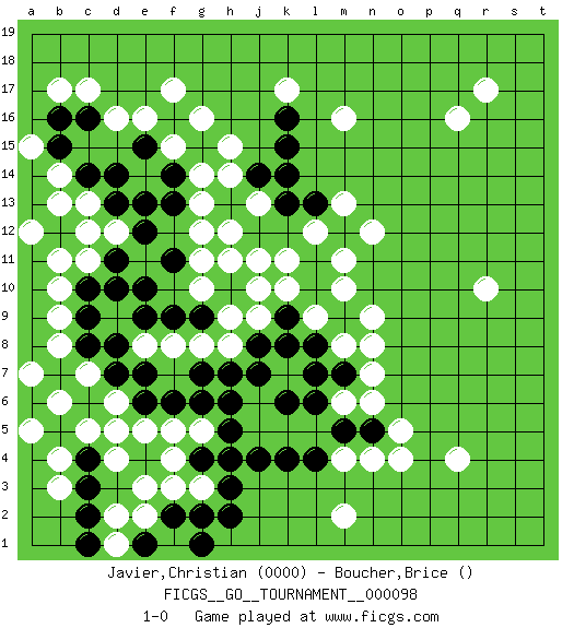 Last move : 1-0 2022 September 21 1:55:6 [Event "FICGS__GO__TOURNAMENT__000098"] [Site "FICGS"] [Date "2022.02.15"] [Round "1"] [Black "Javier,Christian"] [White "Boucher,Brice"] [Result "1-0"] [Rating 1 "0000"] 1.k16 d4 2.k4 d16 3.d10 h4 4.g4 g5 5.h5 g3 6.h3 f4 7.j4 q4 8.g4 q16 9.h4 e3 10.g6 f5 11.f6 e5 12.e6 r10 13.d5 c5 14.c6 d6 15.d7 d5 16.b5 b6 17.c4 c7 18.a6 b4 19.c3 a5 20.b7 a7 21.a8 b8 22.a9 b9 23.a10 b10 24.a11 b11 25.b12 a12 26.g2 f3 27.f2 e2 28.e1 d2 29.c2 d1 30.g1 b3 31.h2 m16 32.h6 b13 33.c12 d12 34.d11 c11 35.c10 c13 36.c9 e8 37.c8 k17 38.e12 g8 39.e10 g10 40.d8 g12 41.f11 g11 42.f9 f8 43.e13 g13 44.g9 h9 45.e7 o4 46.f13 m4 47.g7 h8 48.h13 h14 49.j8 j9 50.j7 g14 51.f14 g16 52.g15 j13 53.j10 k10 54.h10 j11 55.d13 c12 56.k9 h11 57.c14 b14 58.f16 h15 59.e15 f15 60.e9 e16 61.d14 f17 62.k8 m8 63.k6 m2 64.b15 a15 65.b16 c17 66.h7 m11 67.k13 m13 68.j14 h12 69.c16 b17 70.l10 j10 71.l11 m10 72.m12 n12 73.c1 r17 74.m9 n9 75.l8 l9 76.m7 l12 77.k15 k11 78.l6 n7 79.l4 m6 80.l7 n8 81.m5 n6 82.n5 o5 83.k14 n4 84.l13 1-0 This go game has been lost on time (started : 2022.02.15 9:28:26) Here are the names of the openings (joseki) played in the four corners : Corner d16 : d16 a11 Hoshi (Hwajeom, Seongjeom, Xingwei`) 4-4 Point. The star or hoshi (4-4) point, emphasizing influence at the potential expense of territory. Player Black won this Go (weiqi, baduk) game. Follow this game move after move (download)Proverbs do not apply to White. (Tero Sand) There is no instance of a country having benefited from prolonged warfare. (Sun Tzu)