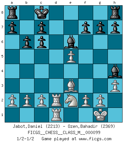 Last move : 1/2-1/2 2022 March 6 20:6:28 [Event "FICGS__CHESS__CLASS_M__000099"] [Site "FICGS"] [Date "2022.02.15"] [Round "1"] [White "Jabot,Daniel"] [Black "Ozen,Bahadir"] [Result "1/2-1/2"] [WhiteElo "2213"] [BlackElo "2369"] 1.e4 e5 2.Nf3 Nc6 3.Bb5 Nf6 4.O-O Nxe4 5.d4 Nd6 6.Bxc6 dxc6 7.dxe5 Nf5 8.Qxd8+ Kxd8 9.h3 Be7 10.Nc3 Nh4 11.Nxh4 Bxh4 12.Be3 Bd7 13.Rad1 Kc8 14.Rd2 b6 15.Rfd1 Be6 16.Ne2 1/2-1/2 Ruy Lopez : Berlin defense, Open variation Kingside Castling by player White (move 4) This chess game ended in a draw. Follow this game move after move (download)Chess, like love, is infectious at any age. (Flohr) Sie bekommen vielleicht den Eindruck, dass die Spitzenspieler überhaupt gar nicht so stark sind. Aber das stimmt nicht. Es ist eine Illusion. Mit einem Computer an der Seite ist es sehr leicht, Urteile zu fällen, aber wenn man alleine am Brett sitzt, sieht die Sache ganz anders aus. (Vladimir Kramnik) Después de una mala apertura, hay una esperanza en el juego medio. Pero una vez que estas en finales, el momento de la verdad ha llegado. (Edmar Mednis) 'L'échange des dames est un coup dur pour les deux adversaires...' Un journaliste lors d'une partie du match Spassky-Fischer It's not the size of the dog in the fight, it's the size of the fight in the dog. (Mark Twain)