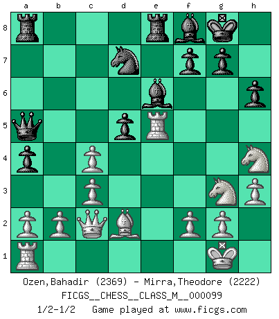 Last move : 1/2-1/2 2022 February 25 7:6:28 [Event "FICGS__CHESS__CLASS_M__000099"] [Site "FICGS"] [Date "2022.02.15"] [Round "1"] [White "Ozen,Bahadir"] [Black "Mirra,Theodore"] [Result "1/2-1/2"] [WhiteElo "2369"] [BlackElo "2222"] 1.e4 e5 2.Nf3 Nc6 3.Bc4 Bc5 4.O-O Nf6 5.d3 d6 6.c3 O-O 7.h3 h6 8.Re1 a5 9.Nbd2 Be6 10.Bb5 Qb8 11.Nf1 Qa7 12.Re2 a4 13.Ng3 Qa5 14.Bxc6 bxc6 15.Nh4 Rfe8 16.Re1 d5 17.exd5 cxd5 18.Rxe5 Bf8 19.Qc2 c5 20.Bd2 c4 21.dxc4 Nd7 22.Rh5 Nf6 23.Re5 Nd7 1/2-1/2 Giuoco Piano Kingside Castling by player White (move 4) Kingside Castling by player Black (move 6) This chess game ended in a draw. Follow this game move after move (download)Even the laziest King flees wildly in the face of a double check ! (Aaron Nimzowitsch) Du musst nicht gut spielen, es reicht, wenn du besser spielst als dein Gegner. (Anonymous) Una buena memoria, concentración, imaginación y una fuerte voluntad, se requiere para llegar a ser un buen jugador. (Bobby Fischer) Je ne suis pas le dernier à jouer lâchement des coups douteux pendant le zeïtnot de l'adversaire pour l'achever: en effet les coups qui font le plus peur sont ceux que l'on ne comprend pas. Je me fais souvent peur quand je joue. (Un professeur anonyme) At last I discovered the true beauty of chess. So I proposed to her. (Dinesh De Silva)