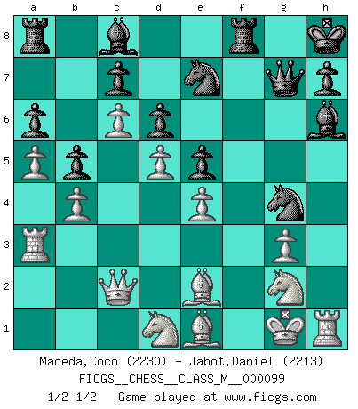 Last move : 1/2-1/2 2022 July 17 2:33:50 [Event "FICGS__CHESS__CLASS_M__000099"] [Site "FICGS"] [Date "2022.02.15"] [Round "1"] [White "Maceda,Coco"] [Black "Jabot,Daniel"] [Result "1/2-1/2"] [WhiteElo "2230"] [BlackElo "2213"] 1.d4 Nf6 2.c4 g6 3.Nc3 Bg7 4.e4 O-O 5.Nf3 d6 6.Be2 e5 7.O-O Nc6 8.d5 Ne7 9.Ne1 Nd7 10.Be3 f5 11.f3 f4 12.Bf2 g5 13.b4 Nf6 14.c5 Ng6 15.c6 b6 16.a4 a6 17.g4 fxg3 18.hxg3 Nh5 19.Kh2 Qf6 20.Ra3 Ne7 21.Rh1 g4 22.Kg1 Qg6 23.fxg4 Nf6 24.g5 Qxg5 25.Ng2 Ng4 26.Be1 Bh6 27.Qc2 Kh8 28.Nd1 Qg7 29.a5 b5 1/2-1/2 King's Indian : 4.e4 Kingside Castling by player Black (move 4) Kingside Castling by player White (move 7) This chess game ended in a draw. Follow this game move after move (download)Dazzling combinations are for the many, shifting wood is for the few. (Georg Kieninger) Auf Remis zu spielen ist gewissermaßen ein Verbrechen gegen das Schachspiel. (Mikhail Nekhemyevich Tal) El Ajedrez se juega con la mente... ¡no con las manos!. (Renaud y Kahn) Des combinaisons [dans le jeu d'échecs] pareilles à des mélodies. Je crois entendre pour ainsi dire la musique des coups... (Vladimir Nabokov) Lottery : A tax on people who are bad at math. (Author unknown)