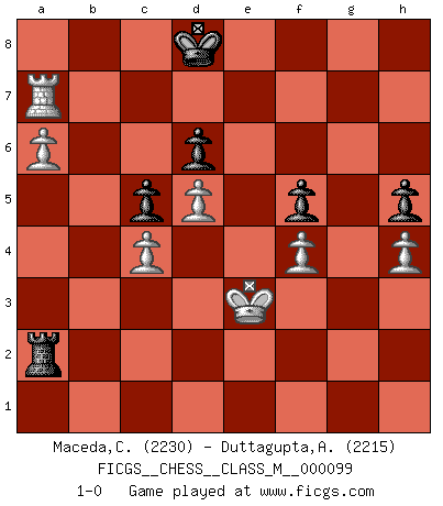 Last move : 1-0 2023 February 23 18:6:53 [Event "FICGS__CHESS__CLASS_M__000099"] [Site "FICGS"] [Date "2022.02.15"] [Round "1"] [White "Maceda,Coco"] [Black "Duttagupta,Aniruddha"] [Result "1-0"] [WhiteElo "2230"] [BlackElo "2215"] 1.d4 Nf6 2.c4 g6 3.Nc3 Bg7 4.e4 d6 5.Nf3 O-O 6.Be2 e5 7.O-O Nc6 8.d5 Ne7 9.Ne1 Nd7 10.f3 f5 11.Nd3 Kh8 12.Be3 c5 13.b4 cxb4 14.Nxb4 Ng8 15.Qd2 Nc5 16.exf5 gxf5 17.Nd3 b6 18.Nxc5 bxc5 19.Rab1 Bf6 20.f4 e4 21.Rb3 Rf7 22.Rfb1 Rg7 23.Bf2 Bd7 24.Bd1 h6 25.Ne2 Ba4 26.Rh3 Be8 27.Rhb3 Ba4 28.Re3 Bxd1 29.Qxd1 Bh4 30.Be1 Kh7 31.Bc3 Bf6 32.Ng3 Bxc3 33.Rxc3 Qf6 34.Rcb3 Qg6 35.Qh5 Rf8 36.Kf1 Qf6 37.Ne2 Qe7 38.a4 Qd7 39.Ng3 Ne7 40.Ra3 Qc8 41.Rb5 Qd7 42.Qe2 Ng8 43.Nh5 Re7 44.a5 Qd8 45.a6 Ref7 46.Qb2 Nf6 47.Nxf6+ Qxf6 48.Qxf6 Rxf6 49.Rb7+ R6f7 50.Rab3 Rg7 51.Rxg7+ Kxg7 52.Rb7+ Rf7 53.Kf2 h5 54.Kg3 Kf6 55.Rb8 Rg7+ 56.Kf2 e3+ 57.Kxe3 Rxg2 58.Rf8+ Ke7 59.Ra8 Ra2 60.Rxa7+ Kd8 61.h4 1-0 King's Indian : Orthodox, Aronin-Taimanov variation (Yugoslav attack / Mar del Plata variation) Kingside Castling by player Black (move 5) Kingside Castling by player White (move 7) Player White won this chess game. Follow this game move after move (download)Chess is a matter of delicate judgment, knowing when to punch and how to duck. (Bobby Fischer) Es war undenkbar für die Behörden, dass ein sowjetischer Großmeister auf diese Art und Weise [Fischer-Taimanov 6:0] verliert, ohne dass es eine politischer Erklärung dafür gäbe. (Mark Taimanov) Cualquier cambio de material en una posición debe venir por medio de un mate, una captura o promoción de Peón. (Purdy) Avec des compensations pour le matériel en plus... (Anonyme) Life doesn't imitate art, it imitates bad television. (Woody Allen)