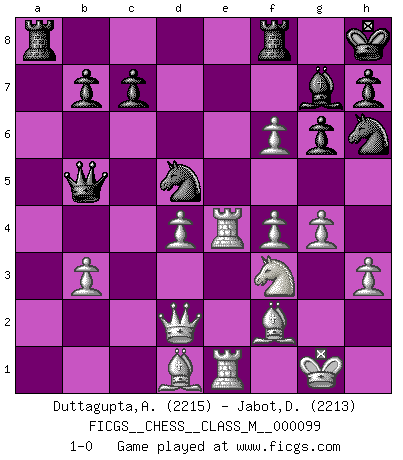 Last move : 1-0 2022 December 22 19:1:24 [Event "FICGS__CHESS__CLASS_M__000099"] [Site "FICGS"] [Date "2022.02.15"] [Round "1"] [White "Duttagupta,Aniruddha"] [Black "Jabot,Daniel"] [Result "1-0"] [WhiteElo "2215"] [BlackElo "2213"] 1.d4 Nf6 2.c4 g6 3.f3 Bg7 4.e4 O-O 5.Be3 e6 6.Nc3 d5 7.e5 Nfd7 8.cxd5 exd5 9.f4 Nc6 10.Nf3 Nb6 11.b3 f6 12.Be2 a5 13.O-O Be6 14.Qd2 a4 15.Rac1 axb3 16.axb3 Na5 17.Bd1 Bf5 18.h3 Nc6 19.Re1 Qd7 20.Bf2 Rae8 21.Bh4 Kh8 22.Nb5 Be4 23.Kh2 Qf7 24.Rf1 Qe7 25.Be2 Nc8 26.Rce1 Nb6 27.Kg1 Qd7 28.Nc3 Ne7 29.Bd1 Nf5 30.Bf2 Ra8 31.Nxe4 dxe4 32.Rxe4 Nd5 33.Rfe1 Qb5 34.g4 Nh6 35.exf6 1-0 This chess game has been lost on time (started : 2022.02.15 15:52:31) King's Indian defense Kingside Castling by player Black (move 4) Kingside Castling by player White (move 13) Player White won this chess game. Follow this game move after move (download)I like to say that Bobby Fischer was the greatest player ever. But what made Fischer a genius was his ability to blend an American freshness and pragmatism with Russian ideas about strategy. (Bruce Pandolfini) Das typische an einem Großmeister ist, daß er eine gewonnene Position schnell und schmerzlos gewinnt. (Irving Chernev) Yo nunca en mi vida he jugado la Defensa Francesa, que viene siendo la más aburrida de todas las Aperturas. (Wilhelm Steinitz) Que feriez-vous si vous étiez en train de jouer aux échecs et que la fin du monde arrive ? Je continuerais à jouer. (Saint Borromée) Begin at the beginning and go on till you come to the end; then stop. (Lewis Carrol, Alice in Wonderland)