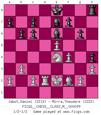 Last move : 1/2-1/2 2022 April 16 12:32:39 [Event "FICGS__CHESS__CLASS_M__000099"] [Site "FICGS"] [Date "2022.02.15"] [Round "1"] [White "Jabot,Daniel"] [Black "Mirra,Theodore"] [Result "1/2-1/2"] [WhiteElo "2213"] [BlackElo "2222"] 1.e4 e5 2.Nf3 Nc6 3.Bb5 Nf6 4.O-O Nxe4 5.d4 Nd6 6.Bxc6 dxc6 7.dxe5 Nf5 8.Qxd8+ Kxd8 9.h3 Be7 10.Nc3 Nh4 11.Nxh4 Bxh4 12.f4 g6 13.Be3 h5 14.Rad1+ Ke8 15.Rd2 Be6 16.Rfd1 Rd8 17.Bf2 Rxd2 18.Rxd2 Bd8 19.Ne4 b6 20.b3 h4 21.Kf1 Be7 22.Ke2 1/2-1/2 Ruy Lopez : Berlin defense, Open variation Kingside Castling by player White (move 4) This chess game ended in a draw. Follow this game move after move (download)It was clear to me that the vulnerable point of the American Grandmaster (Bobby Fischer) was in double-edged, hanging, irrational positions, where he often failed to find a win even in a won position. (Efim Geller) Fischer ist das größte Genie, das je vom Schachhimmel heruntergestiegen ist. (Mikhail Nekhemyevich Tal) El Peón aislado arroja penumbra sobre todo el tablero. (Aaron Nimzovich) Des points faibles ou des trous dans la position de l'adversaire doivent être occupés par des pièces et non pas par des pions. (Siegbert Tarrasch) Memory is a way of holding onto the things you love, the things you are, the things you never want to lose. (from the television show: The Wonder Years)