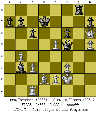 Last move : 1/2-1/2 2022 March 5 22:9:5 [Event "FICGS__CHESS__CLASS_M__000099"] [Site "FICGS"] [Date "2022.02.15"] [Round "1"] [White "Mirra,Theodore"] [Black "Cirulis,Ilmars"] [Result "1/2-1/2"] [WhiteElo "2222"] [BlackElo "2261"] 1.d4 d5 2.c4 c6 3.Nf3 Nf6 4.g3 Bg4 5.Ne5 Bf5 6.Qb3 Qb6 7.cxd5 Nxd5 8.Qd1 e6 9.Nc3 Bb4 10.Qd2 Nd7 11.Nxd7 Kxd7 12.a3 Qa5 13.axb4 Qxa1 14.Bg2 Nxc3 15.bxc3 Rhd8 16.O-O Bg6 17.h4 Qb1 18.g4 f6 19.h5 Be4 20.f3 Bc2 21.g5 Bb3 22.gxf6 gxf6 23.Qh6 Rg8 24.Bd2 Qc2 25.Rc1 Qf5 26.Kh2 Rxg2+ 27.Kxg2 Rg8+ 28.Kf2 e5 29.dxe5 1/2-1/2 Theodore Mirra Thank you for a very fun game. I learned that 4.g3 is not so great in this opening. Ilmars Cirulis Thank you too! :) QGD Slav : 3.Nf3 Kingside Castling by player White (move 16) This chess game ended in a draw. Follow this game move after move (download)When you don't know what to play, wait for an idea to come into your opponent's mind. You may be sure that idea will be wrong. (Siegbert Tarrasch) Es gibt nur zwei wahre Schachgenies - das andere war Wilhelm Steinitz, der Weltmeister von 1872 bis 1894. (Robert James Fischer) Después de una mala apertura, hay una esperanza en el juego medio. Pero una vez que estas en finales, el momento de la verdad ha llegado. (Edmar Mednis) La vie et les Echecs sont tous les deux une lutte constante. (Lasker) Internet: Absolute communication, absolute isolation. (Paul Carvel)