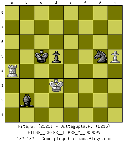 Last move : 1/2-1/2 2022 December 14 7:4:18 [Event "FICGS__CHESS__CLASS_M__000099"] [Site "FICGS"] [Date "2022.02.15"] [Round "1"] [White "Rita,Giacomo"] [Black "Duttagupta,Aniruddha"] [Result "1/2-1/2"] [WhiteElo "2325"] [BlackElo "2215"] 1.e4 e5 2.Nf3 Nc6 3.Bb5 Nf6 4.O-O Nxe4 5.Re1 Nd6 6.Nxe5 Be7 7.Bf1 Nxe5 8.Rxe5 O-O 9.d4 Ne8 10.d5 Bc5 11.Re1 d6 12.Nc3 Bf5 13.Ne4 Bxe4 14.Rxe4 f5 15.Rf4 a5 16.Bd3 g6 17.Qf3 Nf6 18.Bxf5 gxf5 19.Rxf5 Nd7 20.Qg3+ Kh8 21.Bh6 Qe7 22.Bxf8 Rxf8 23.Rxf8+ Qxf8 24.Re1 Nb6 25.h4 Nxd5 26.Re4 b5 27.a4 bxa4 28.Rxa4 Bb6 29.h5 h6 30.Re4 Qf7 31.Rg4 Ne7 32.Qh4 Nf5 33.Rf4 Qe7 34.Qxe7 Nxe7 35.c3 Nd5 36.Rf5 Ne7 37.Rb5 Kg7 38.Kf1 Ng8 39.f4 Nf6 40.Ke2 Kf7 41.Kf3 d5 42.g4 Ke6 43.Rb3 Ne4 44.Ra3 c6 45.Ra1 Bc7 46.Ke3 Nf6 47.Kf3 Ne4 48.Re1 Kf7 49.Re2 a4 50.c4 Ba5 51.cxd5 cxd5 52.Re3 Bb4 53.Rd3 Ke6 54.Ke2 Bc5 55.Kf3 Kd6 56.Rd1 Kc6 57.g5 hxg5 58.fxg5 Nxg5+ 59.Ke2 Be7 60.Rd4 Bf6 61.Rb4 Kc5 62.Rxa4 Bxb2 63.Kd3 1/2-1/2 Ruy Lopez : Berlin defense, Open variation Kingside Castling by player White (move 4) Kingside Castling by player Black (move 8) 10 pieces endgame at move 58 : White KRPPP , Black KBNPP WHITE : King + 1 Rook 3 Pawns BLACK : King + 1 Bishop 1 Knight 2 Pawns 9 pieces endgame at move 58 : White KRPP , Black KBNPP WHITE : King + 1 Rook 2 Pawns BLACK : King + 1 Bishop 1 Knight 2 Pawns 8 pieces endgame at move 62 : White KRPP , Black KBNP WHITE : King + 1 Rook 2 Pawns BLACK : King + 1 Bishop 1 Knight 1 Pawn 7 pieces endgame at move 62 : White KRP , Black KBNP WHITE : King + 1 Rook 1 Pawn BLACK : King + 1 Bishop 1 Knight 1 Pawn This chess game ended in a draw. Follow this game move after move (download)I have always a slight feeling of pity for the man who has no knowledge of Chess. (Siegbert Tarrasch) Ich bin stolz ein Bulgare zu sein. (Veselin Topalov) Entre mas años cumplo, mas valoro los Peones. (Keres) Psychologiquement, tu dois avoir confiance en toi même, mais cette confiance doit être basée sur des faits. (Robert Fischer) In every real man a child is hidden that wants to play. (Friedrich Nietzsche)