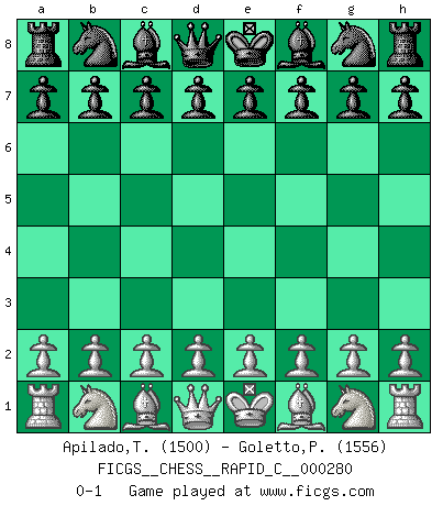 Last move : 0-1 2022 March 20 8:21:19 [Event "FICGS__CHESS__RAPID_C__000280"] [Site "FICGS"] [Date "2022.02.17"] [Round "1"] [White "Apilado,Teofilo"] [Black "Goletto,Piero Giuseppe"] [Result "0-1"] [WhiteElo "1500"] [BlackElo "1556"] 0-1 This chess game has been lost on time (started : 2022.02.17 20:8:59) Player Black won this chess game. Follow this game move after move (download)The only thing Chess players have in common is Chess. (Lodewijk Prins) Der Schachmeister von Heute braucht Courage, einen Killerinstinkt, Ausdauer und Arroganz. (Larry Evans) De todos mis libros Rusos, la defensa contiene y difunde el 'calor' mas grande que pudiese verse extraño al observar lo supremamente abstracto que el Ajedrez supuestamente es. (Vladimir Nabokov) Les Echecs ne sont pas pour les âmes timides. Ils requièrent un homme entier, qui ne s'arrête pas aveuglément à ce qui a été déjà établi, mais qui tente individuellement de sonder les profondeurs du jeu. (W. Steinitz) Horse racing is animated roulette. (Roger Kahn)