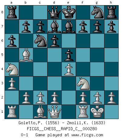 Last move : 0-1 2022 March 30 1:15:39 [Event "FICGS__CHESS__RAPID_C__000280"] [Site "FICGS"] [Date "2022.02.17"] [Round "1"] [White "Goletto,Piero Giuseppe"] [Black "Zmolil,Karel"] [Result "0-1"] [WhiteElo "1556"] [BlackElo "1633"] 1.e4 e5 2.Nf3 Nc6 3.Nc3 Bb4 4.a3 Be7 5.Bb5 d6 6.O-O Bd7 7.Na4 a6 0-1 This chess game has been lost on time (started : 2022.02.17 20:8:59) Three knights game Kingside Castling by player White (move 6) Player Black won this chess game. Follow this game move after move (download)I have added these principles to the law: get the Knights into action before both Bishops are developed. (Emanuel Lasker) Schach ist eine Sache der genauen Beurteilung, wann man zuschlagen und wann man sich ducken muss. (Robert James Fischer) Una partida de Ajedrez se divide en 3 etapas: la primera cuando piensas que tienes la ventaja, la segunda cuando crees que tienes la ventaja y la tercera... ¡cuando te das cuenta que vas a perder!. (Savielly Tartakower) Le succès, c'est être capable d'aller d'échec en échec sans perdre son enthousiasme. (Winston Churchill) Art is not a thing, it is a way. (Elbert Hubbard)