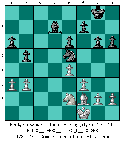 Last move : 1/2-1/2 2007 September 22 12:30:13 [Event "FICGS__CHESS__CLASS_C__000053"] [Site "FICGS"] [Date "2007.07.29"] [Round "1"] [White "Nent,Alexander"] [Black "Staggat,Rolf"] [Result "1/2-1/2"] [WhiteElo "1666"] [BlackElo "1661"] 1.d4 Nf6 2.c4 e6 3.Nc3 Bb4 4.Qc2 O-O 5.a3 Bxc3+ 6.Qxc3 b6 7.Bg5 Bb7 8.f3 h6 9.Bh4 d5 10.e3 Nbd7 11.cxd5 Nxd5 12.Bxd8 Nxc3 13.Bh4 Nd5 14.Bf2 c5 15.e4 Nf4 16.Bb5 Rfd8 17.Ne2 a6 18.Bc4 Ng6 19.O-O cxd4 20.Nxd4 Nde5 21.Rfc1 Nxc4 22.Rxc4 Rac8 23.Rac1 Ne5 24.Rxc8 Rxc8 25.Rxc8+ Bxc8 26.b3 Bd7 27.Ne2 b5 28.Kf1 g6 1/2-1/2 Nimzo-Indian : Classical variation Kingside Castling by player Black (move 4) Kingside Castling by player White (move 19) This chess game ended in a draw. Follow this game move after move (download)I like the moment when I break a man's ego. (Bobby Fischer) Ich würde mich als ganz normalen Jungen bezeichnen [Im Alter von 12]. (Sergej Karjakin) El Ajedrez es una manera fabulosa para que los niños aprendan a autovalorarse y a autoestimarse. (Saudin Robovic) J'apprécie les joueurs d'est-indienne, c'est grâce à eux que je nourris ma famille depuis tant d'années. (Petrosian) Two beer, or not two beer. (Unknown)