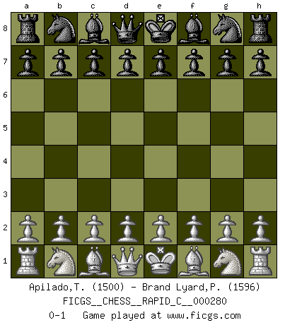 Last move : 0-1 2022 March 20 8:21:19 [Event "FICGS__CHESS__RAPID_C__000280"] [Site "FICGS"] [Date "2022.02.17"] [Round "1"] [White "Apilado,Teofilo"] [Black "Brand Lyard,Paul"] [Result "0-1"] [WhiteElo "1500"] [BlackElo "1596"] 0-1 This chess game has been lost on time (started : 2022.02.17 20:8:59) Player Black won this chess game. Follow this game move after move (download)Avoid the crowd. Do your own thinking independently. Be the Chess player, not the Chess piece. (Ralph Charell) Modernes Schach erfordert enorme Anspannung. Es ist für einen normalen Menschen unmöglich das auszuhalten. (Viktor Kortschnoi) Con el tiempo, empecé a progresar en partidas decisivas. Tal vez porque me di cuenta de una simple verdad: no solo estaba yo nervioso sino también mi oponente. (Mikhail Tal) Des points faibles ou des trous dans la position de l'adversaire doivent être occupés par des pièces et non pas par des pions. (Siegbert Tarrasch) The difference between stupidity and genius is that genius has its limits. (Murphy)