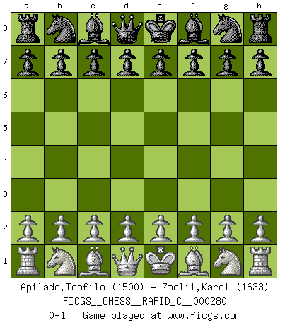 Last move : 0-1 2022 March 20 8:21:19 [Event "FICGS__CHESS__RAPID_C__000280"] [Site "FICGS"] [Date "2022.02.17"] [Round "1"] [White "Apilado,Teofilo"] [Black "Zmolil,Karel"] [Result "0-1"] [WhiteElo "1500"] [BlackElo "1633"] 0-1 This chess game has been lost on time (started : 2022.02.17 20:8:59) Player Black won this chess game. Follow this game move after move (download)Pawn endings are to Chess what putting is to golf. (Cecil Purdy) Sicherlich können nur Meister einen Stil haben. Daß ein nicht-Meister auch nur ein einziges Mal in seinem Leben eine Partie folgerecht durchführte, habe ich niemals bemerkt. (Emanuel Lasker) De todos mis libros Rusos, la defensa contiene y difunde el 'calor' mas grande que pudiese verse extraño al observar lo supremamente abstracto que el Ajedrez supuestamente es. (Vladimir Nabokov) Psychologiquement, tu dois avoir confiance en toi même, mais cette confiance doit être basée sur des faits. (Robert Fischer) Ah, beer! The cause of, and the solution to, all of life's problems. (Homer Simpson)