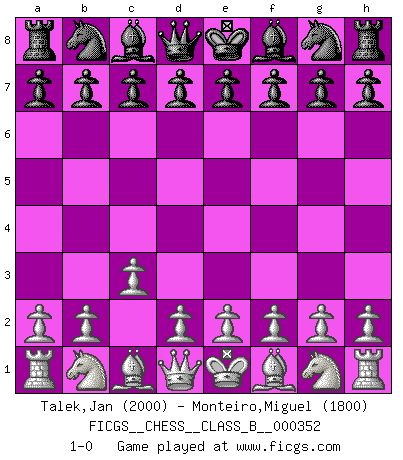 Last move : 1-0 2022 April 1 4:23:51 [Event "FICGS__CHESS__CLASS_B__000352"] [Site "FICGS"] [Date "2022.02.19"] [Round "1"] [White "Talek,Jan"] [Black "Monteiro,Miguel"] [Result "1-0"] [WhiteElo "2000"] [BlackElo "1800"] 1.c3 1-0 This chess game has been lost on time (started : 2022.02.19 7:23:14) Saragossa Opening Player White won this chess game. Follow this game move after move (download)Chess is like war on a board. (Bobby Fischer) Ich hatte Angst gegen einen russischen Großmeister zu verlieren, und er befürchtete gegen einen kleinen Jungen zu verlieren. (über ein Remis gegen Juri Awerbach). (Robert James Fischer) Solo existe una cosa que Fischer hace en el Ajedrez sin placer: ¡perder!. (Boris Spassky) C'est une question de caractère, Beaucoup de gens perdent leur motivation très vite. D'autres, ils sont rares, peuvent la conserver très longtemps. J'aime les échecs, encore aujourd'hui je suis heureux d'analyser des parties. J'aime toujours gagner, je déteste encore perdre. Bien jouer est important pour mon intégrité intellectuelle et morale. Et puis les échecs vivent en ce moment une période historique grâce à Internet. Ils se développent dans les systèmes éducatifs à travers le monde. Ils sortent de leur ghetto, et c'est mon rôle de mener à bien cette révolution. (Gary Kasparov) True nature is revealed in times of difficulty. (Chinese proverb)