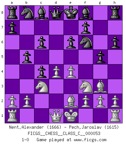 Last move : 1-0 2007 September 19 23:56:19 [Event "FICGS__CHESS__CLASS_C__000053"] [Site "FICGS"] [Date "2007.07.29"] [Round "1"] [White "Nent,Alexander"] [Black "Pech,Jaroslav"] [Result "1-0"] [WhiteElo "1666"] [BlackElo "1615"] 1.d4 d5 2.c4 c6 3.Nf3 Nf6 4.Nc3 e6 5.Bg5 h6 6.Bh4 dxc4 7.e4 g5 8.Bg3 b5 9.Be2 1-0 This chess game has been lost on time (started : 2007.07.29 23:39:57) QGD Slav : 4.Nc3 Player White won this chess game. Follow this game move after move (download)Chess holds its master in its own bonds, shackling the mind and brain so that the inner freedom of the very strongest must suffer. (Albert Einstein) Die unerbitterlichsten Regeln im Schach sind die Ausnahmen. (Savielly Grigorievitsch Tartakower) Preferería tener un Peón que un dedo. (Reuben Fine) Les pièces de l'échiquier étaient impitoyables. Elles le retenaient, elles l'absorbaient. Il y avait de l'horreur en cela, mais aussi une harmonie unique. Car, qu'y a-t-il dans le monde, à part les échecs ? (V. Nabokov) Secret operations are essential in war; upon them the army relies to make its every move. (Sun Tzu)