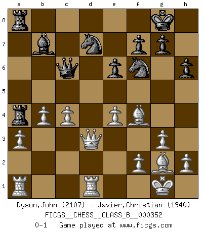 Last move : 0-1 2022 June 18 16:29:55 [Event "FICGS__CHESS__CLASS_B__000352"] [Site "FICGS"] [Date "2022.02.19"] [Round "1"] [White "Dyson,John"] [Black "Javier,Christian"] [Result "0-1"] [WhiteElo "2107"] [BlackElo "1940"] 1.e4 c5 2.Nc3 a6 3.g3 b5 4.Bg2 Bb7 5.Nge2 e6 6.d4 cxd4 7.Nxd4 Nf6 8.a3 Qc7 9.O-O d6 10.Re1 Nbd7 11.Bf4 Be7 12.Ndxb5 axb5 13.Nxb5 Qc6 14.Nxd6+ Bxd6 15.Qxd6 Ra6 16.Qd3 Ra4 17.b4 O-O 18.c4 Rfa8 19.Red1 h6 0-1 This chess game has been lost on time (started : 2022.02.19 7:23:14) Sicilian : Closed Kingside Castling by player White (move 9) Kingside Castling by player Black (move 17) Player Black won this chess game. Follow this game move after move (download)The combination player thinks forward; he starts from the given position, and tries the forceful moves in his mind. (Emanuel Lasker) Ich las kürzlich ein Buch von Nietzsche. Er sagte Religion verdumme nur die Menschen. Ich stimme zu. (Robert James Fischer) Cuando le juegas a Fischer, no es una cuestion de si vas a ganar o perder. Es una cuestion de si vas a sobrevivir. (Boris Spassky) J'apprécie les joueurs d'est-indienne, c'est grâce à eux que je nourris ma famille depuis tant d'années. (Petrosian) Never risk one's whole fortune unless supported by one's entire army. (Niccolo Machiavelli)